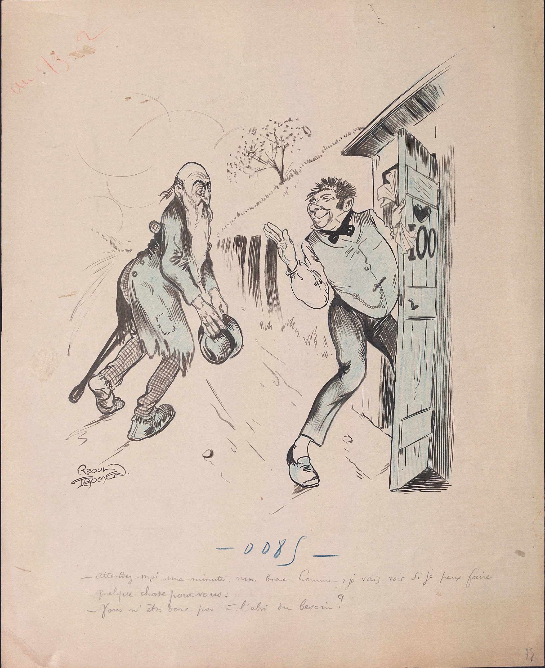 Encre et crayon bleu, signé en bas à droite, légendé au crayon « Tiens mon petit ami voici une pièce de cinq francs ; sois économe et ne la change pas de suite. Soyez tranquille madame je ne la changerai pas: je la dépenserai d’un seul coup », 24 x 31 cm ;
