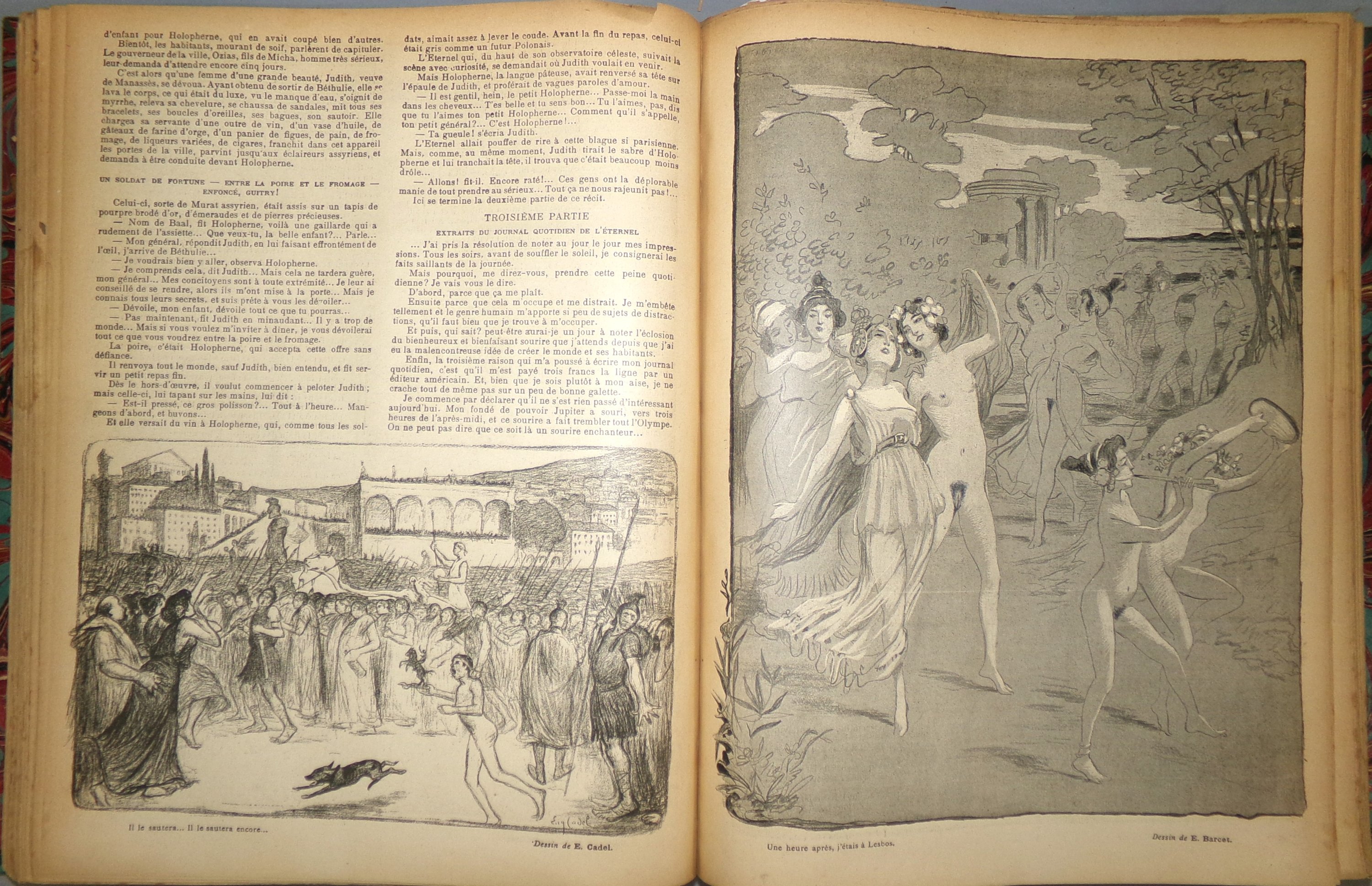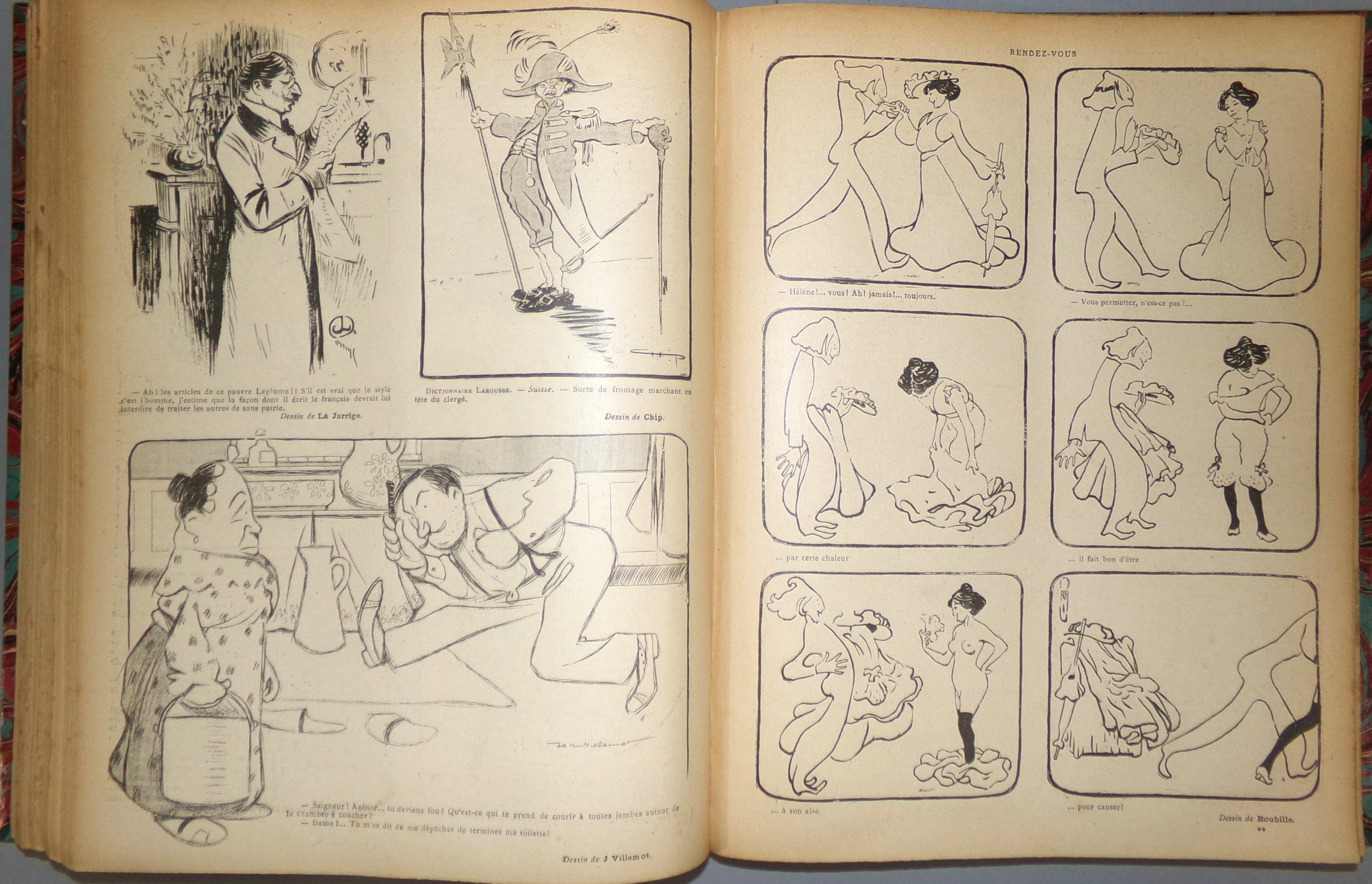 Rare tête de collection de cette revue humoristique illustrée, dirigée par Maurice Méry. Textes d’Alphonse Allais rédacteur en chef sous son nom et sous divers pseudonymes comme Esope fils, Tristan Bernard, Dominique Lebeau, Georges Auriol, Max Jacob sous le pseudonyme de Léon David, etc. Abondantes illustrations de Cappiello, Devambez, Capy, Poulbot, Pourriol, Villemot, Hermann-Paul, Hansi, Léandre, Jacques Villon, Abel Faivre, Maurice Radiguet, Gottlob, Depaquit, Rouveyre, Ferdinand Bac, Iribe, Gus Bofa, Hansi, dont 23 dessins de Sacha Guitry parus du 24 octobre 1903 au 30 juillet 1904.