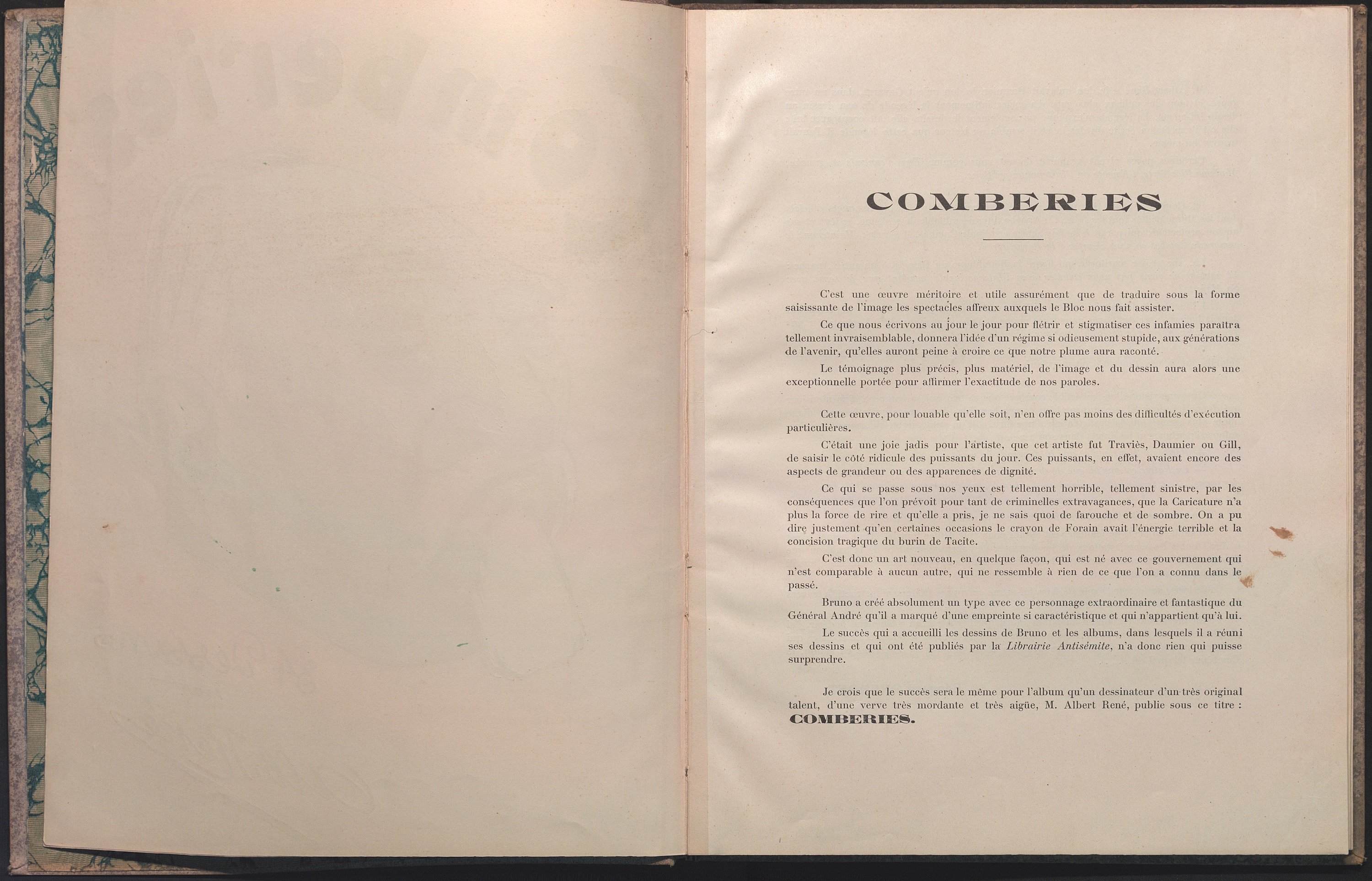 Comberies. Préfaces d'E. Drumont et H. Rochefort. Paris, Librairie antisémite, s.d. [sept. 1904]. In-4 rel., 34 dessins par Albert-René Morice.