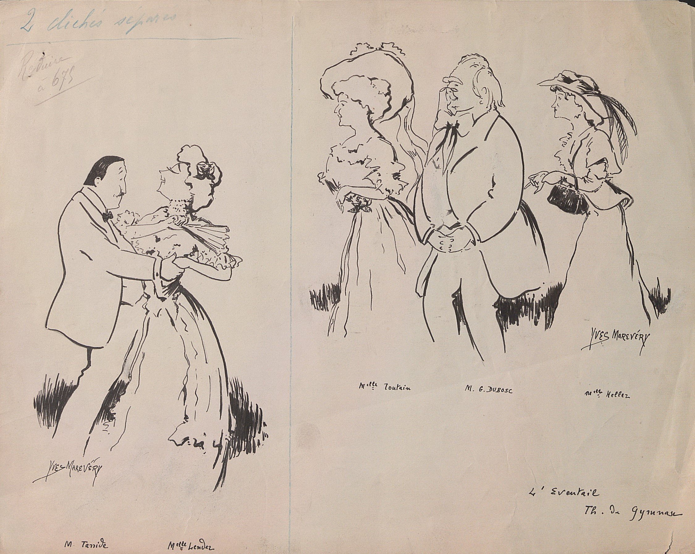 Gaston Dubosc, Blanche Toutain, Abel Tarride, Marcelle Lander et Jane Heller dans L’Eventail joué au théâtre du Gymnase [1907], 24,5 x 30,5 cm ;