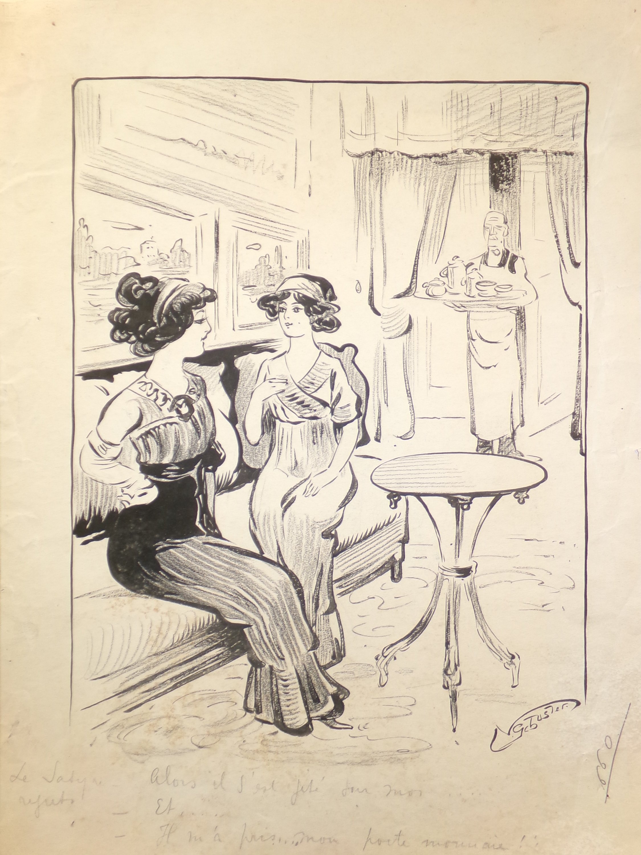 Les commères, encre, signé en bas à droite « Loth », titré et légendé au crayon « Vous savez, la voisine du cintième qui avait des douleurs asiatiques, parait qu’elle a maintenant un concert de l’estomac! », 32 x 40 cm.