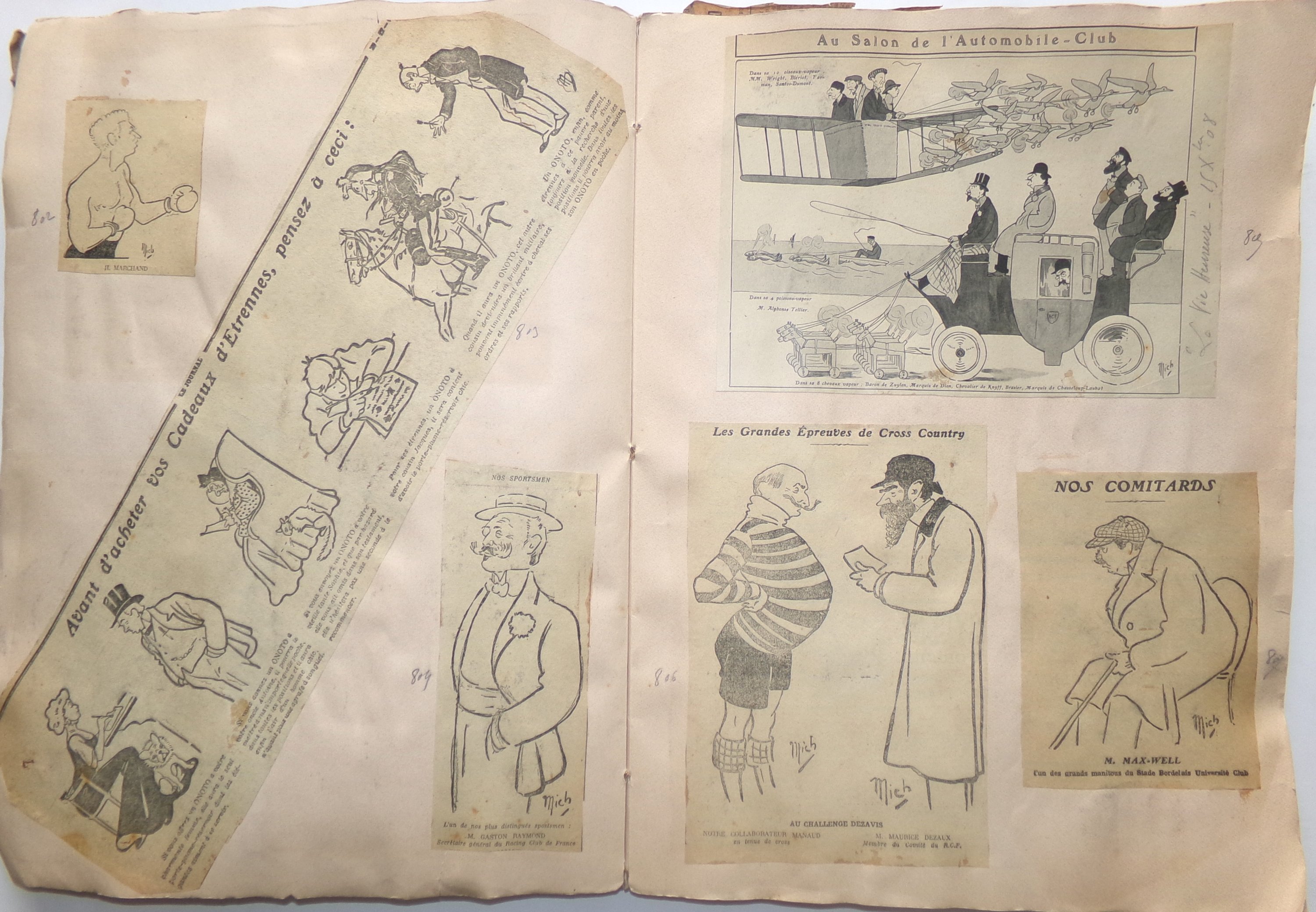 Recueil de portraits et publicités dessinés par Mich, extraits et découpés des journaux et magazines des années 1910-1920, contrecollés sur papier fort in-fol.