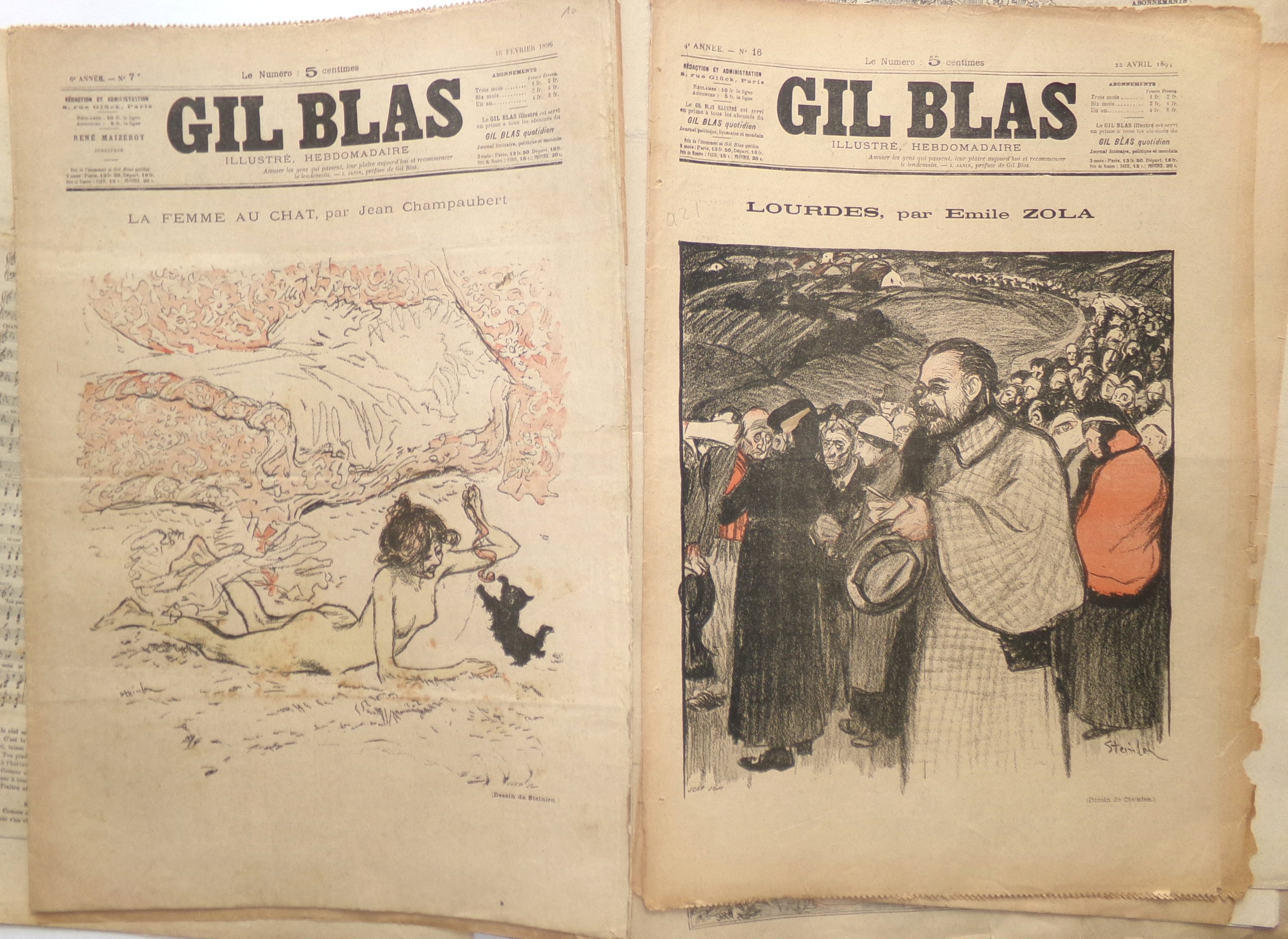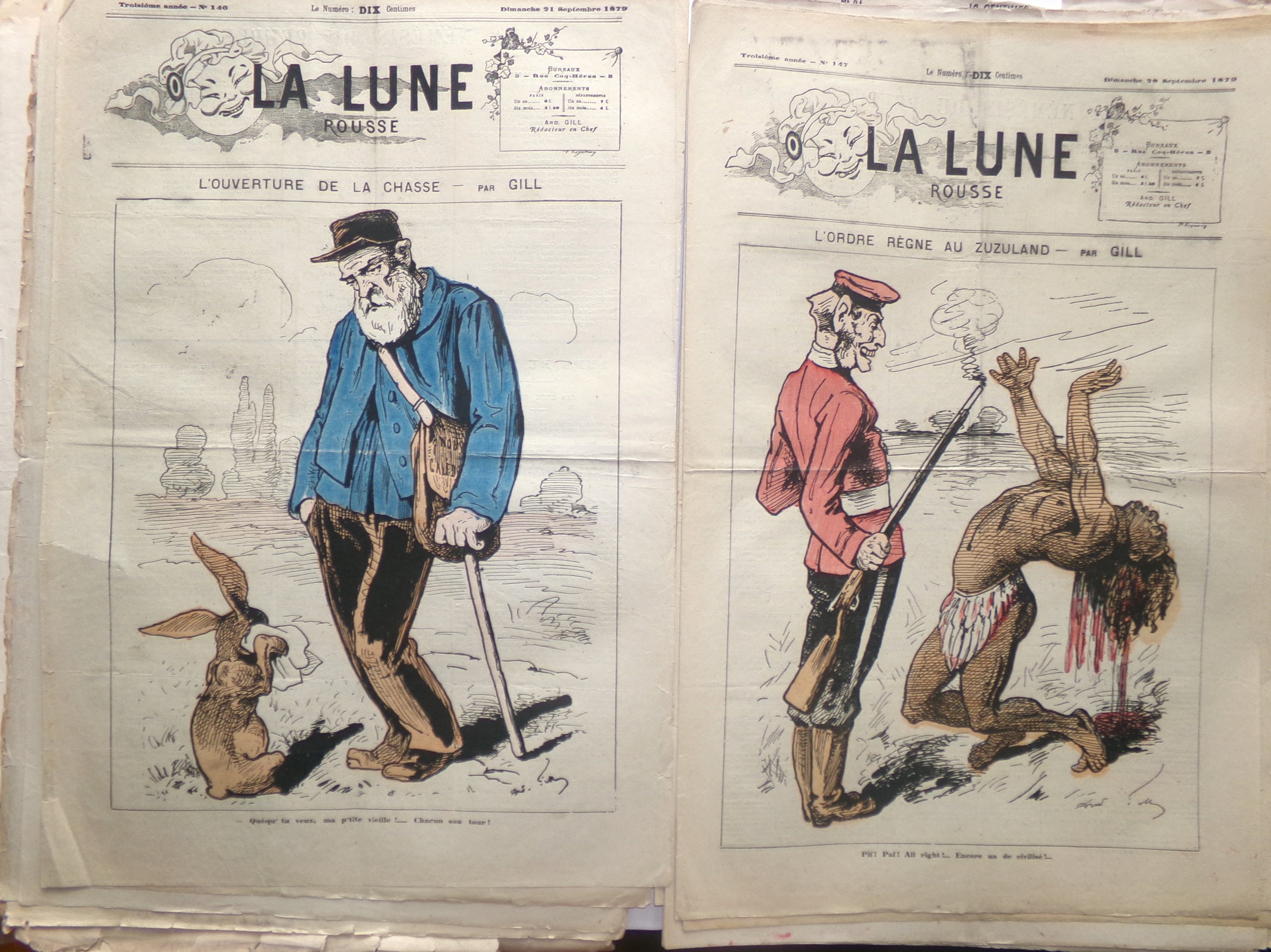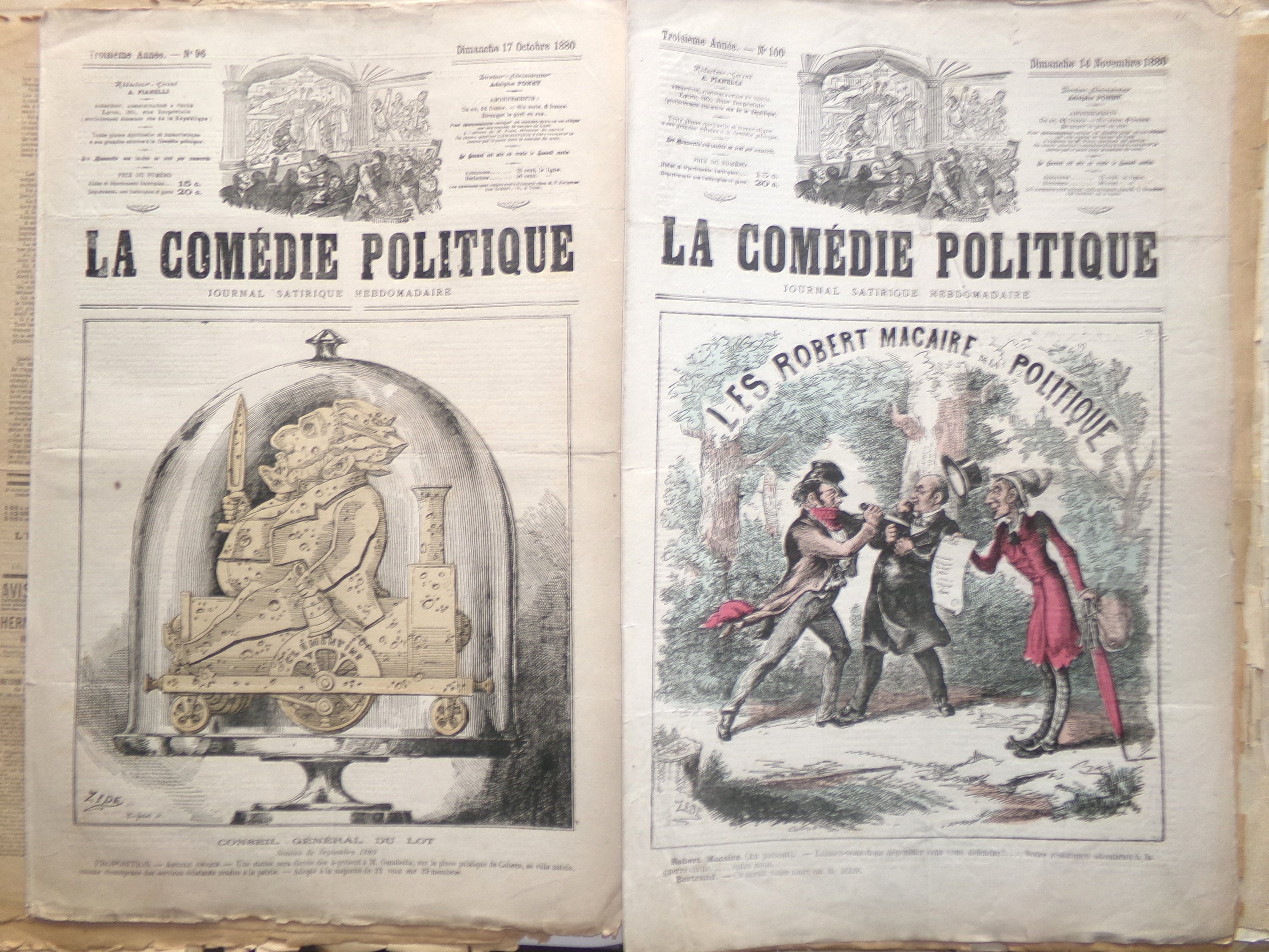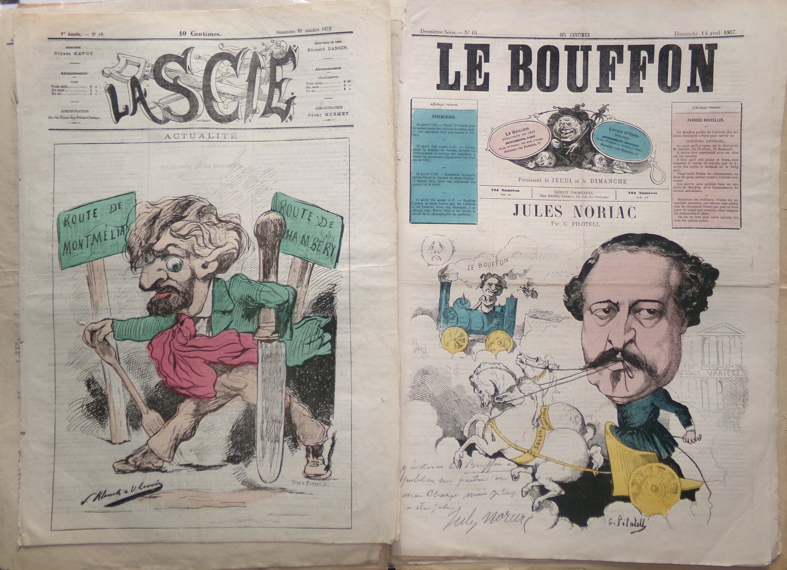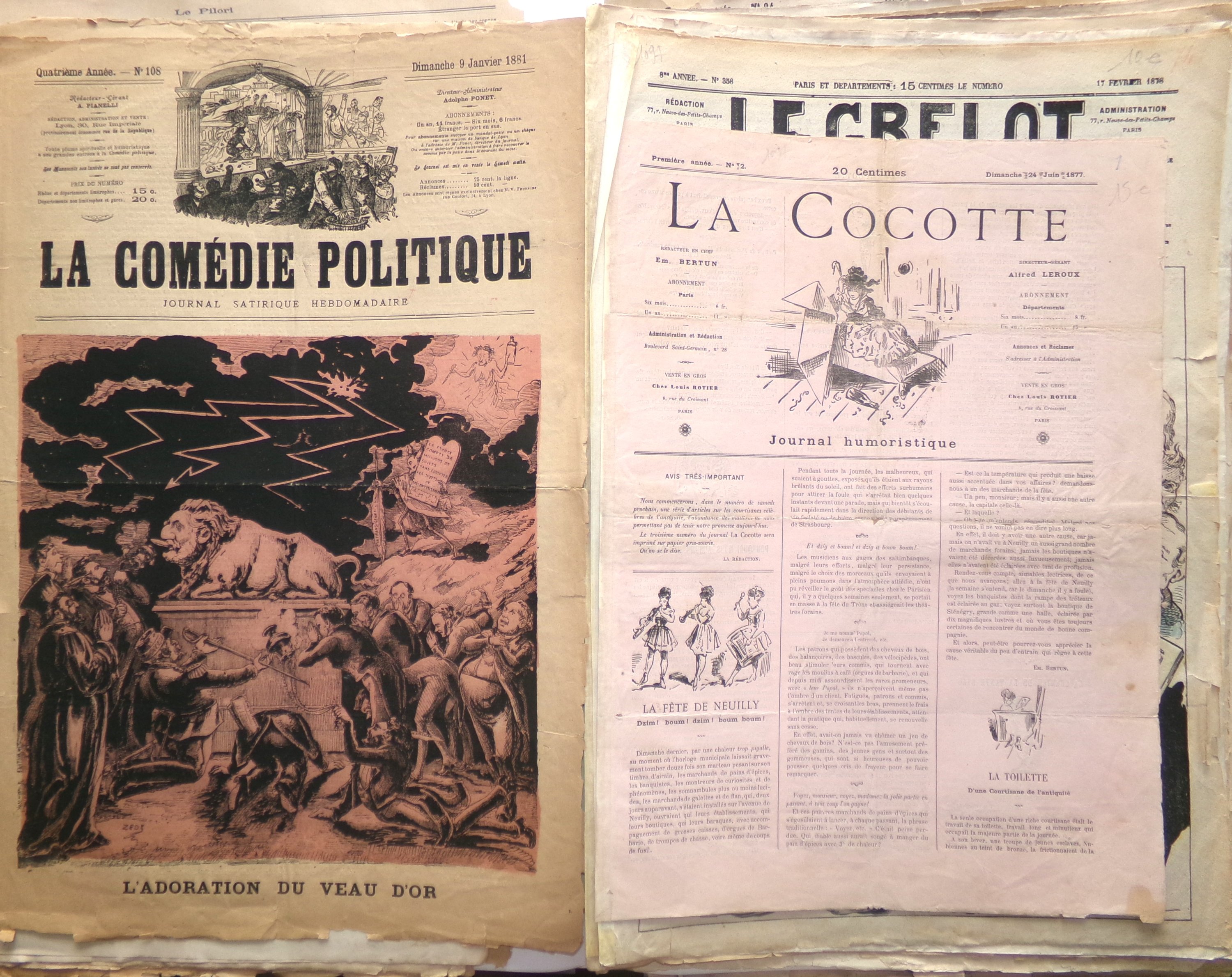 Lot de + de 100 numéros dépareillés de journaux parus entre 1867 et 1913, dont: La Lune (15 ex.), La Lune Rousse (10 ex.), Le Hanneton (11 ex.), Le C ri (5 ex.), La Comédie politique, Le Carillon, Le Clou, Le Tam-Tam, Le Titi, Drolatic-Industry, Le Géant, Gil Blas, La Nouvelle Lune, Paris-Comique, La Silhouette, Le Bouffon, Le Bonnet Rouge, etc.