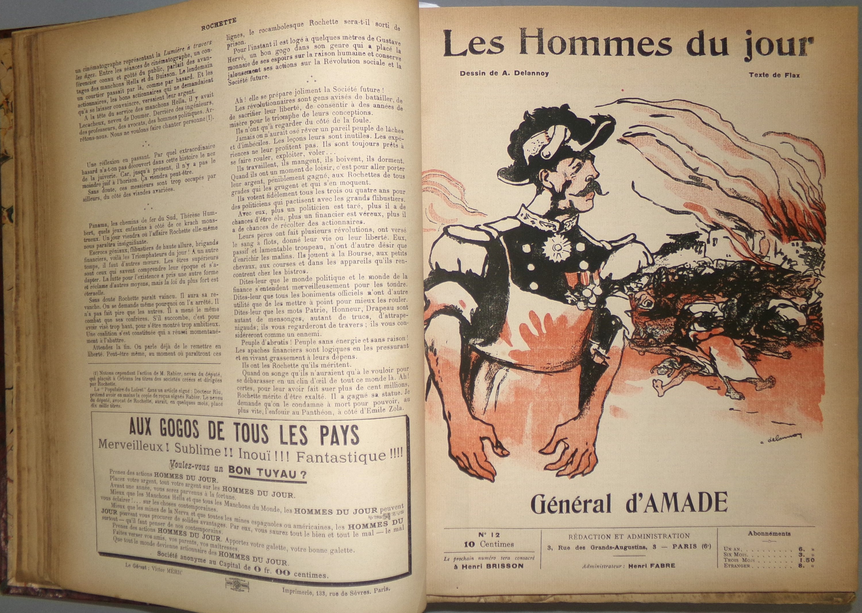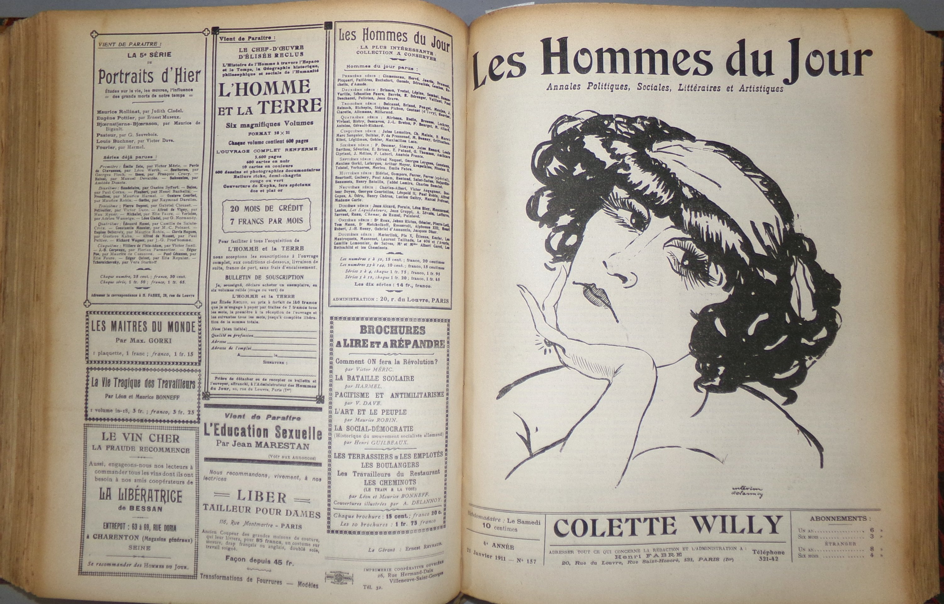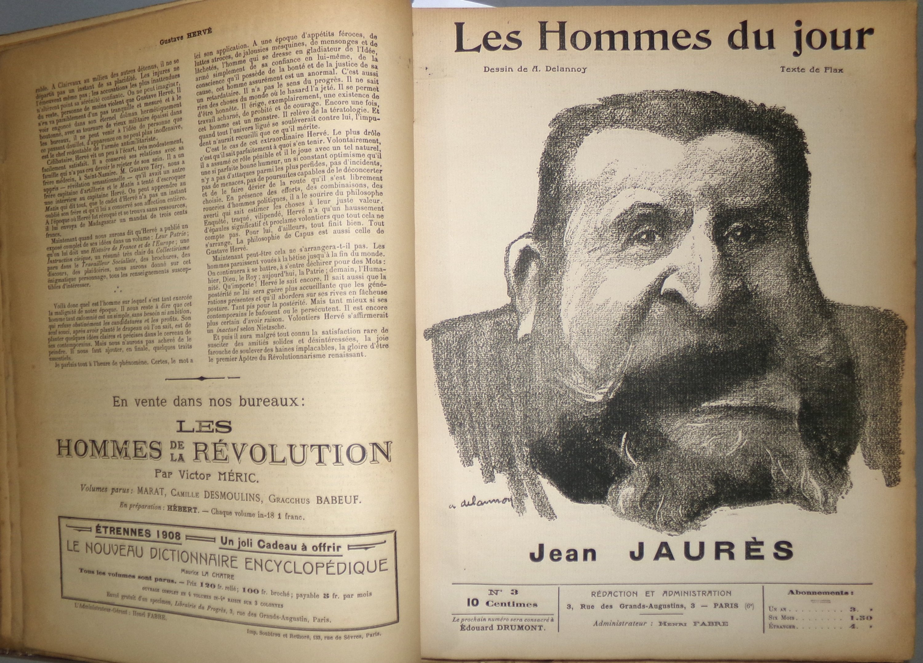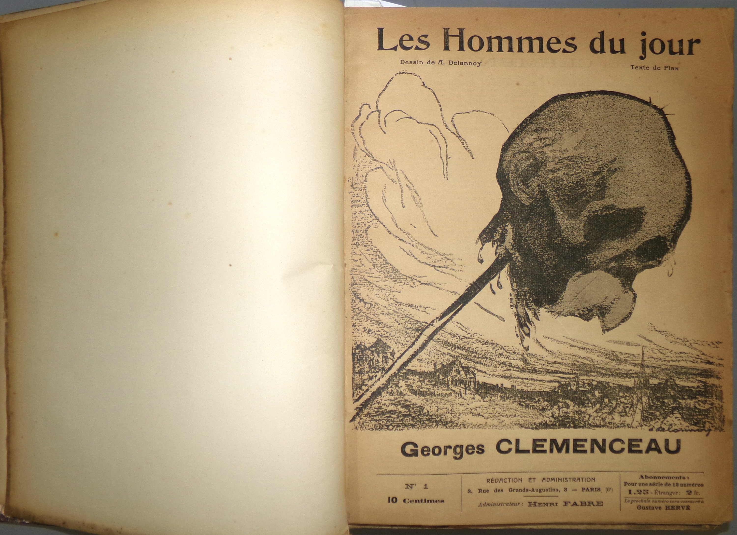 Publiée de 1908 à 1940, Les Hommes du jour est une collection de brochures hebdomadaires grand format d'inspiration libertaire. Elles sont majoritairement rédigées par Victor Méric, sous les pseudonymes de Flax ou Lux, avec une illustration de couverture d'Aristide Delannoy. 245 numéros sortiront jusqu'en septembre 1912.
