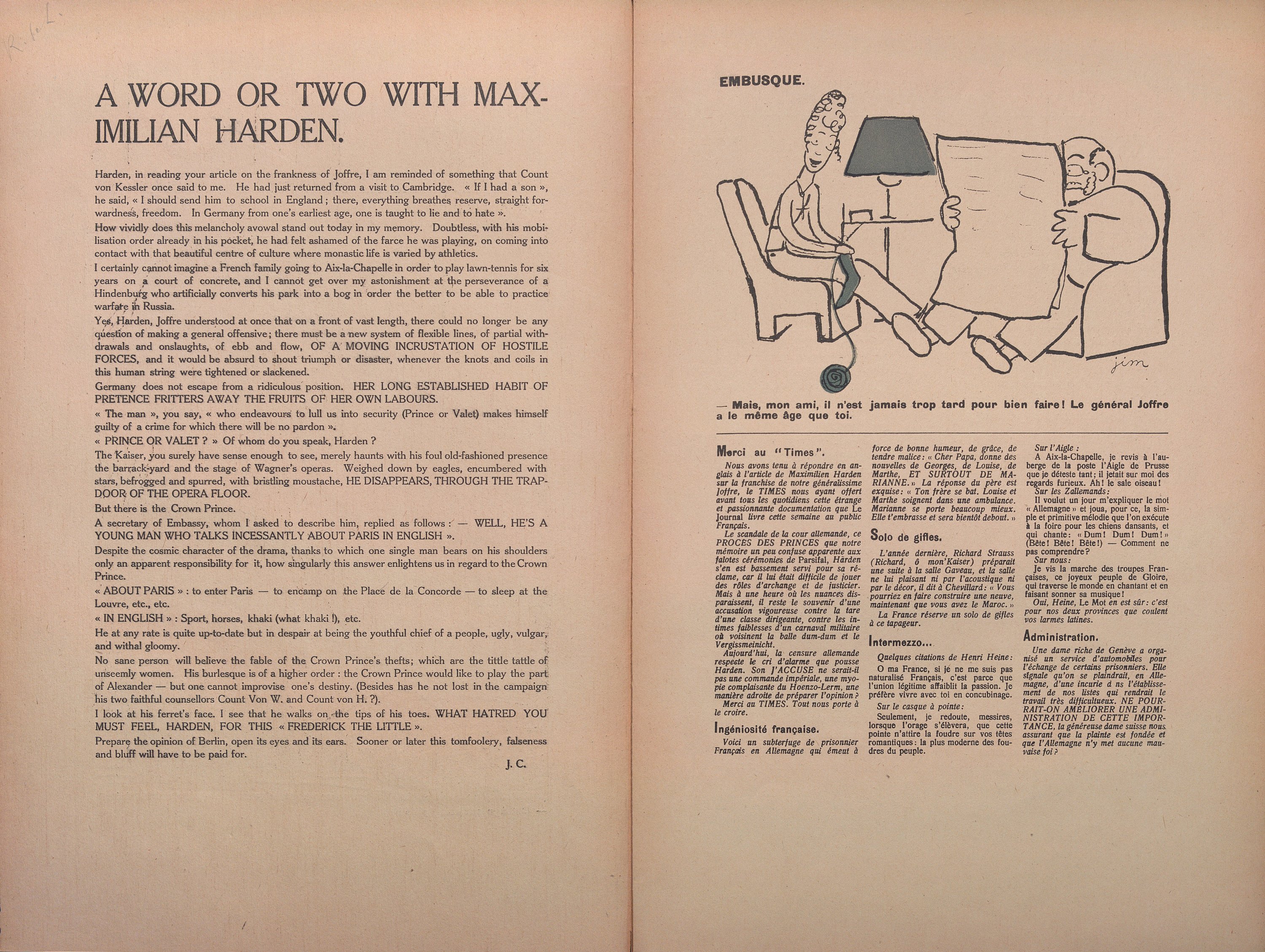 Rare et bel ensemble de cette revue satirique et patriotique, anti-allemande, dirigée par Paul Iribe en collaboration avec Jean Cocteau, que les deux amis, réformés pour raison de santé, fondèrent pour participer à l’effort de guerre.