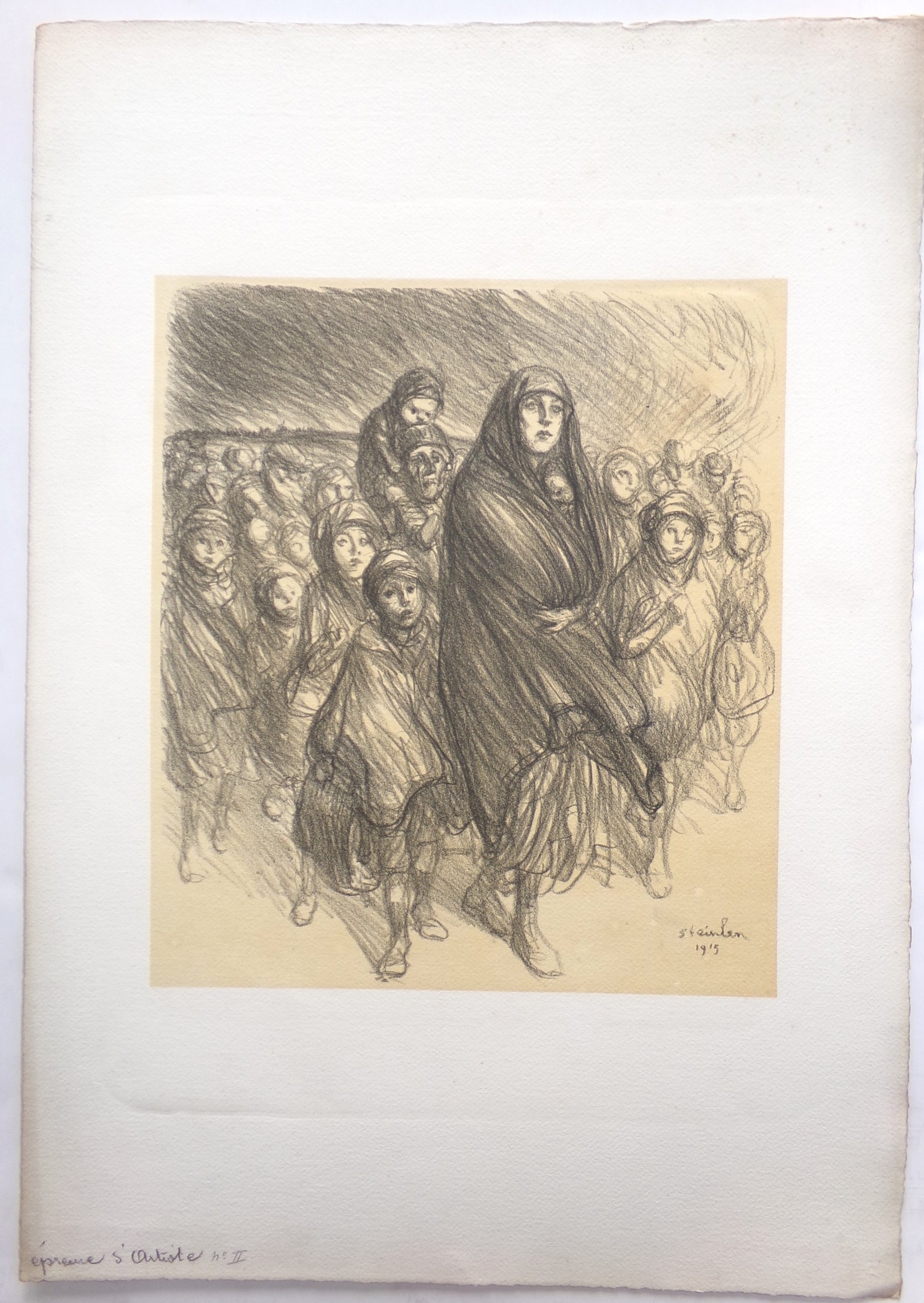 23 épreuves tirées sur fond ocre, dont 19 pl. portent la mention « épreuve d’artiste n°II » et 1 pl. signée au crayon par l’artiste: [Verdunois à la Gare de l'Est] ; [La Gloire] (en couleurs] ; [L’exode belge] ; [Les réfugiés de la Meuse] ; [L’allocation militaire] ; [Les convalescents] ; [Courageuse!] ; [Pour les fillettes des soldats tombés au champ d’honneur] ; [Un vieux de la vieille] ; [L’aide aux mutilés de guerre] ; [Sous la botte] ; [Le secours national] ; [Errant !] ; [Veuves d’un Louis] ; [Pour les familles dispersées] ; [Chiens errants] ; [Serbie. Sœur Anne de France ou d’Italie ne vois tu rien venir] ; [Calvaire serbe] ; [Deux poilus] ; [On ne s’en fait pas] ; [Bat d’Af] ; etc.