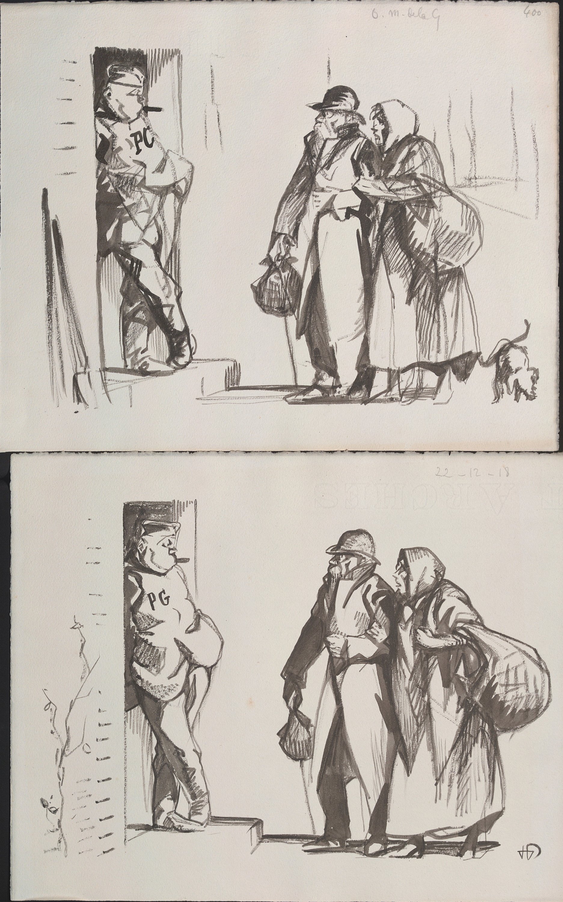 Il s’agit à la fois des ébauches, dessins préparatoires ou maquettes abouties en vue de leur publication dans la presse dont le journal « La Victoire - quotidien révisionniste: organe de la république autoritaire et plébiscitaire » sous la direction de Gustave Hervé paru à partir du 1er janvier 1916.