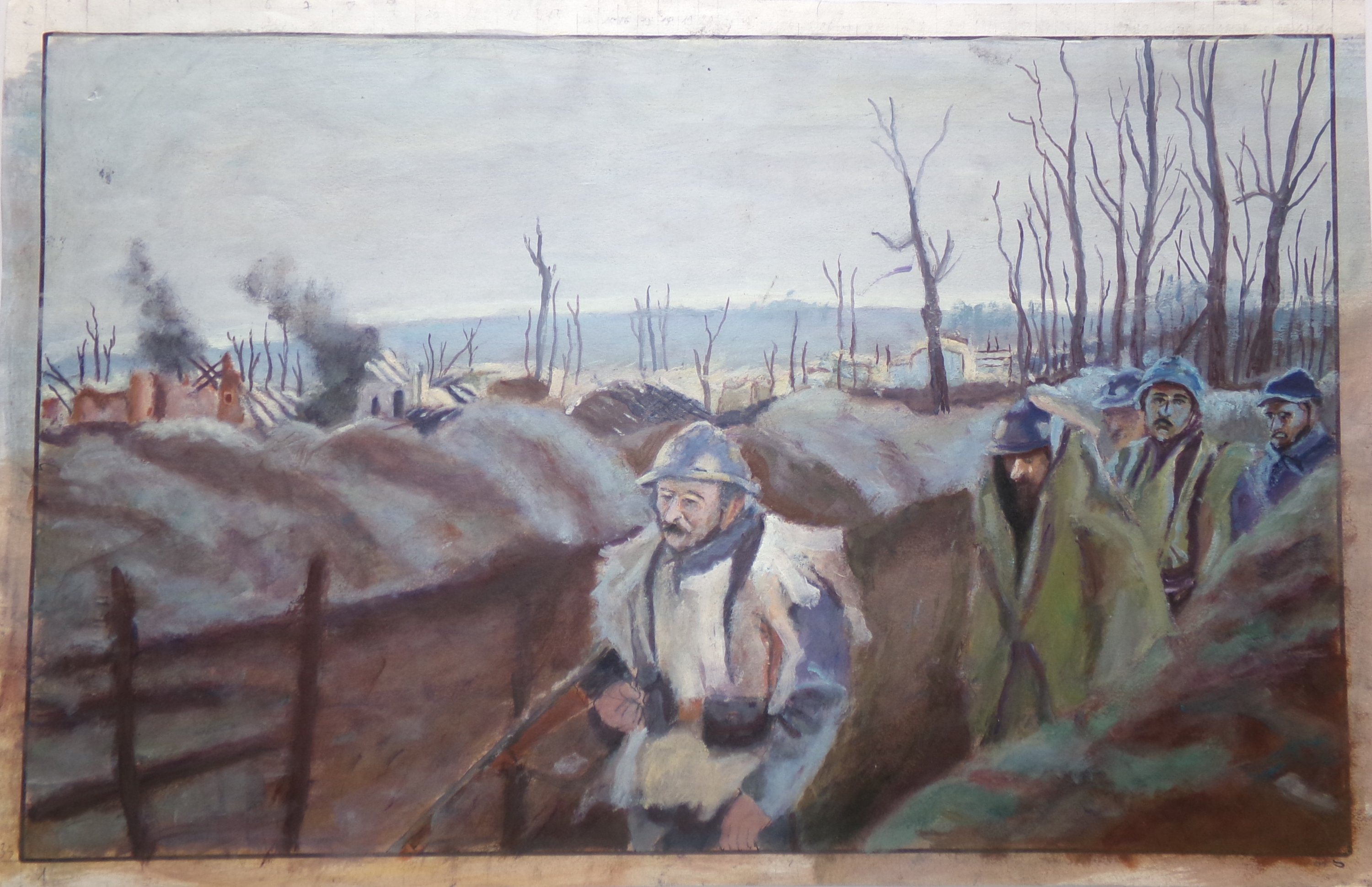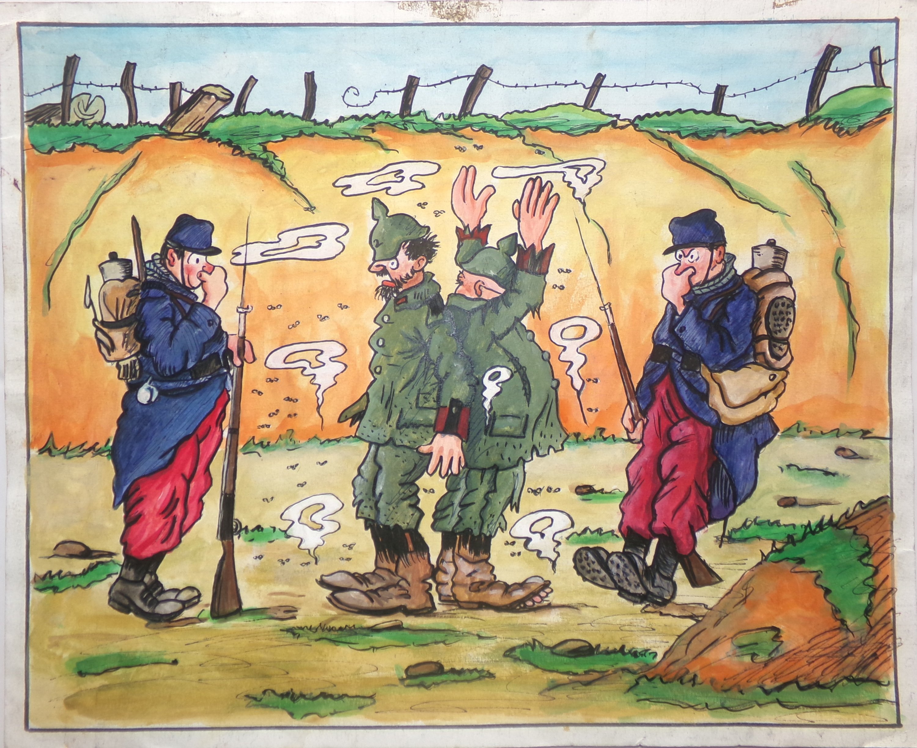 Dont 2 dessins, Combat de tranchée et Travaux forcés daté 1916 et signé en bas à droite Georges Scoté (1884-1971), fait prisonnier en Allemagne d’oct. 1914 à janv. 1919, 46,5 x 38,5 cm et 39 x 57 cm ; 2 scènes humoristiques, titrées et légendées, « Au repos » et « C’est le métier qui vaut ça! », dont un signé « P.D. », 32 x 24 cm ; etc.