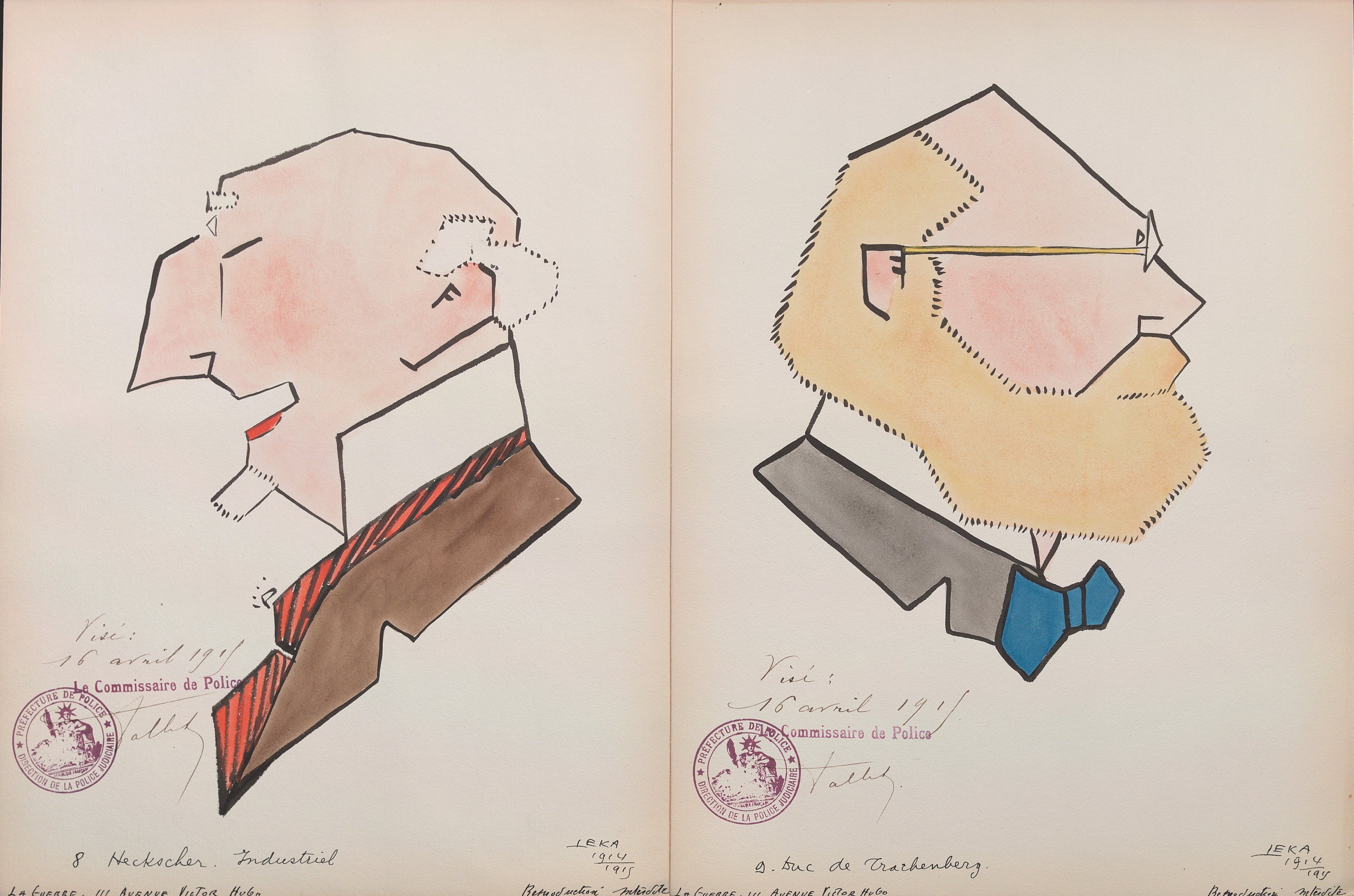 Harry Leka, Leurs intellektuels kubistés par Leka, 16 portraits caricaturés, encre et aquarelle, signés, datés 1914-1915, légendés, chacun portant le visa du commissaire de police de Paris du 16 avril 1915, 31,5 x 23,5 cm ; portraits cubistes de personnalités allemandes ;