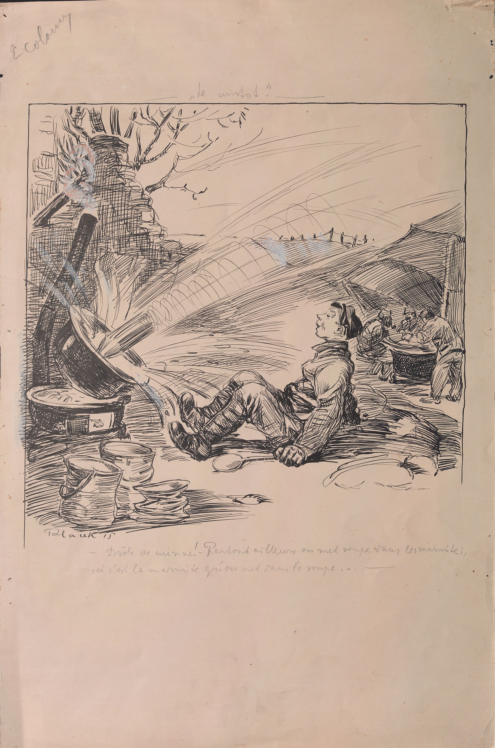 Rudolf Placek (1881-1950), encre et rehauts de blanc, signé et daté 1915, légendé « Drôle de missive! partons ailleurs, on met soupe dans les marmites, ici c’est la marmite qu’on met dans la soupe », 50 x 32,5 cm ;