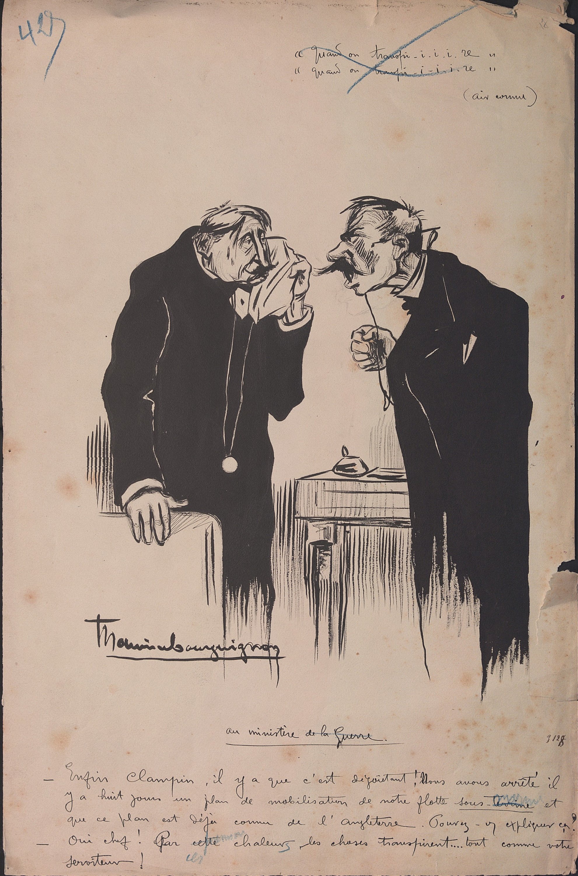 Maurice Bourguignon (1877-1925), Au ministère de la guerre, encre, signé, 50 x 32 cm (petites déchirures en marge, rousseurs) ;