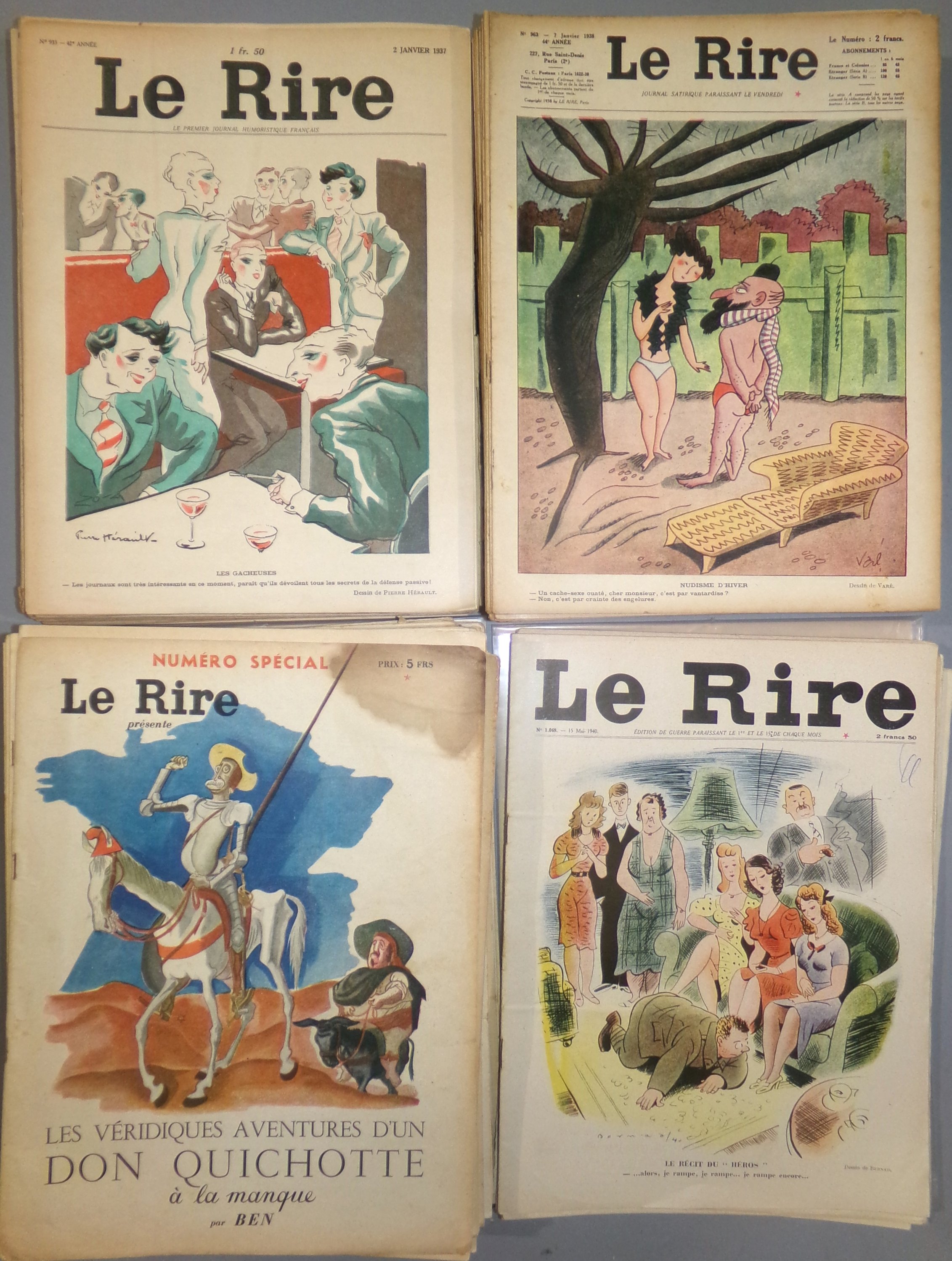 n°1016 (13 janv. 1939) au n°1069 (15 mai 1940), incomplet, 54 ex. non reliés, dont n° spécial Les véridiques aventures d’un Don Quichotte à la manque par Ben ; La presse par Chancel ; ELYsée 19-39 par Sennep ; Les Italiens vus par les Allemands ; Alertes ; Ceux de l’arrière ; Madelons 39 ; Ces dames au grand cœur ; Cantonnements ; Permissionnaires ; Camouflages.