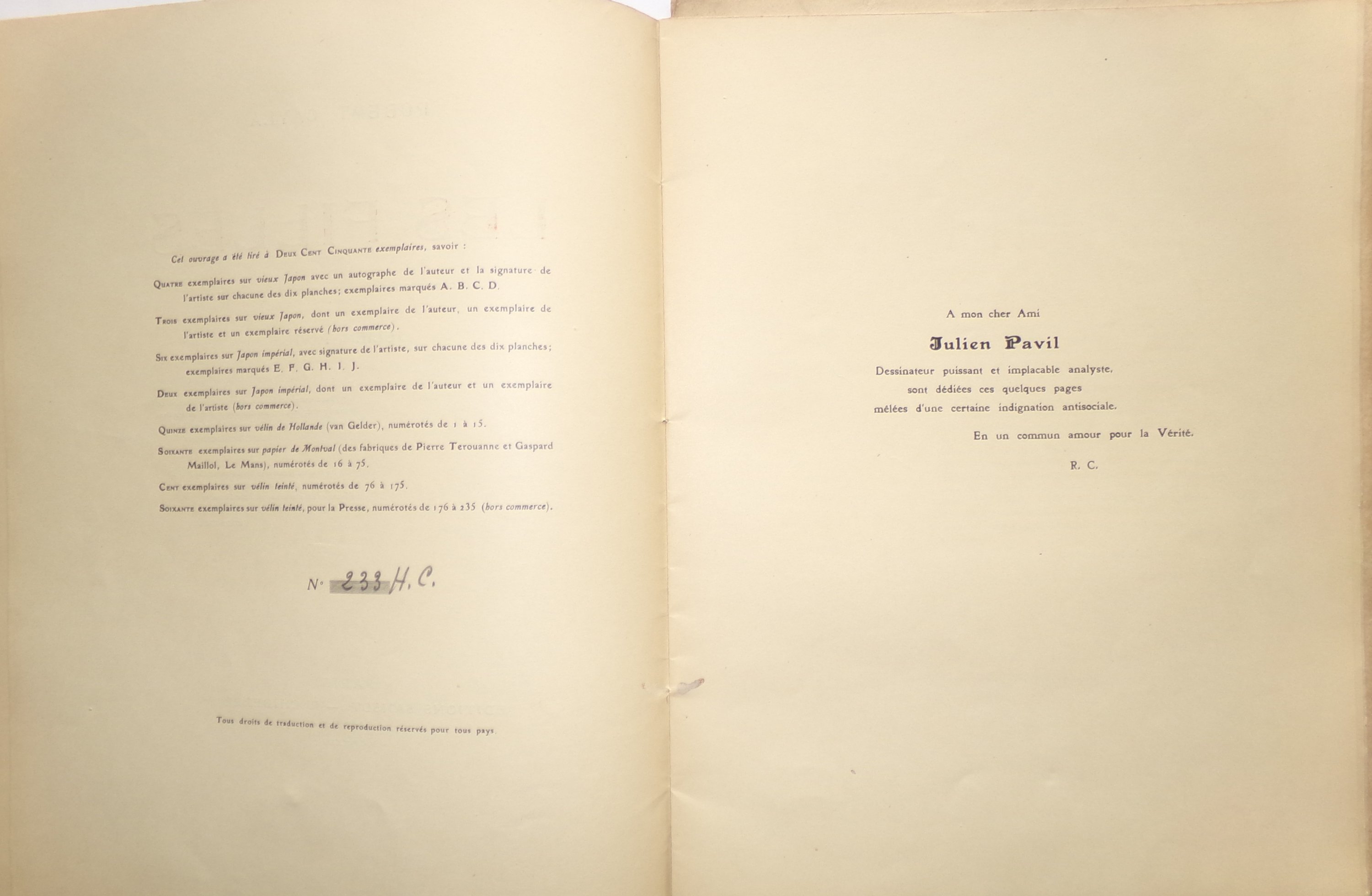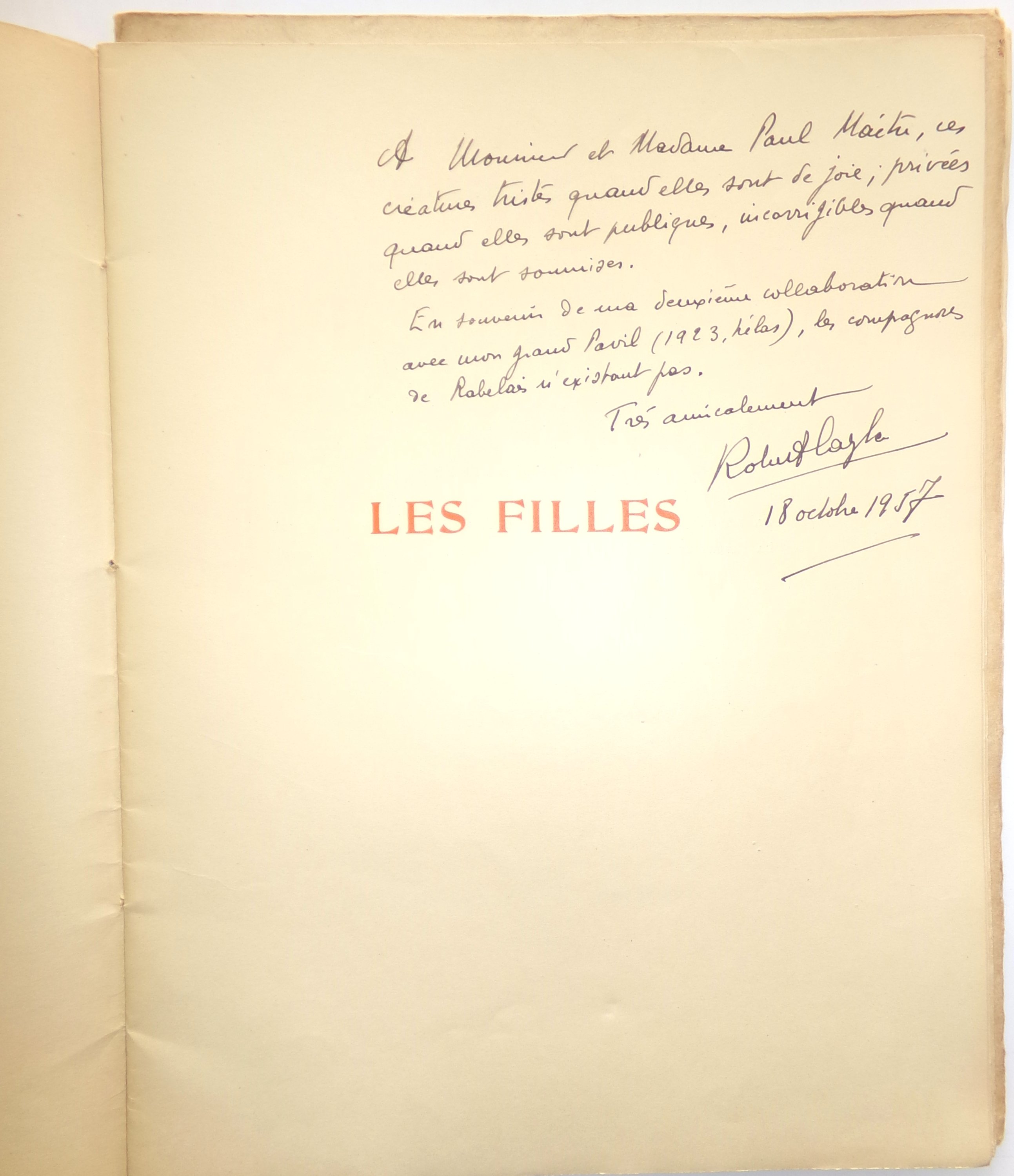 Robert Cayla et Julien Pavil, Les Filles, suite de 10 dessins originaux. Paris, Editions Sansot, 1923. Broch. in-fol., couv. impr. et rempliée, 17 pp. suivies de 10 compositions érotiques en noir impr. sur le thème de la prostitution, dessinées et signées par Julien Pavil. n°60/250 ex. sur vélin teinté. Envoi dédicacé, signé et daté: « A M. et Mme Paul Maître [architecte], ces créatures tristes quand elles sont de joie ; privées quand elles sont publiques, incorrigibles quand elles sont soumises. En souvenir de ma deuxième collaboration avec mon grand Pavil (1923, hélas), les compagnons de Rabelais n’existant pas »