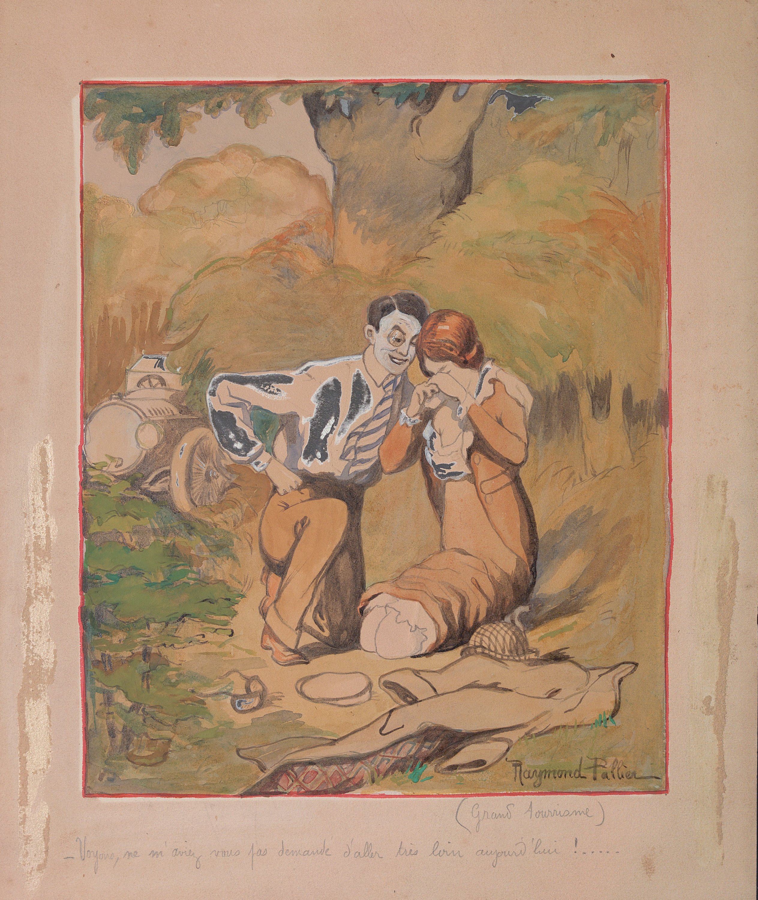 Raymond Pallier (1888-1943), Grand tourisme, encre, aquarelle et gouache, signé, légendé « Voyons, ne m’aviez vous pas demandé d’aller très loin aujourd’hui! », 37 x 30 cm ;