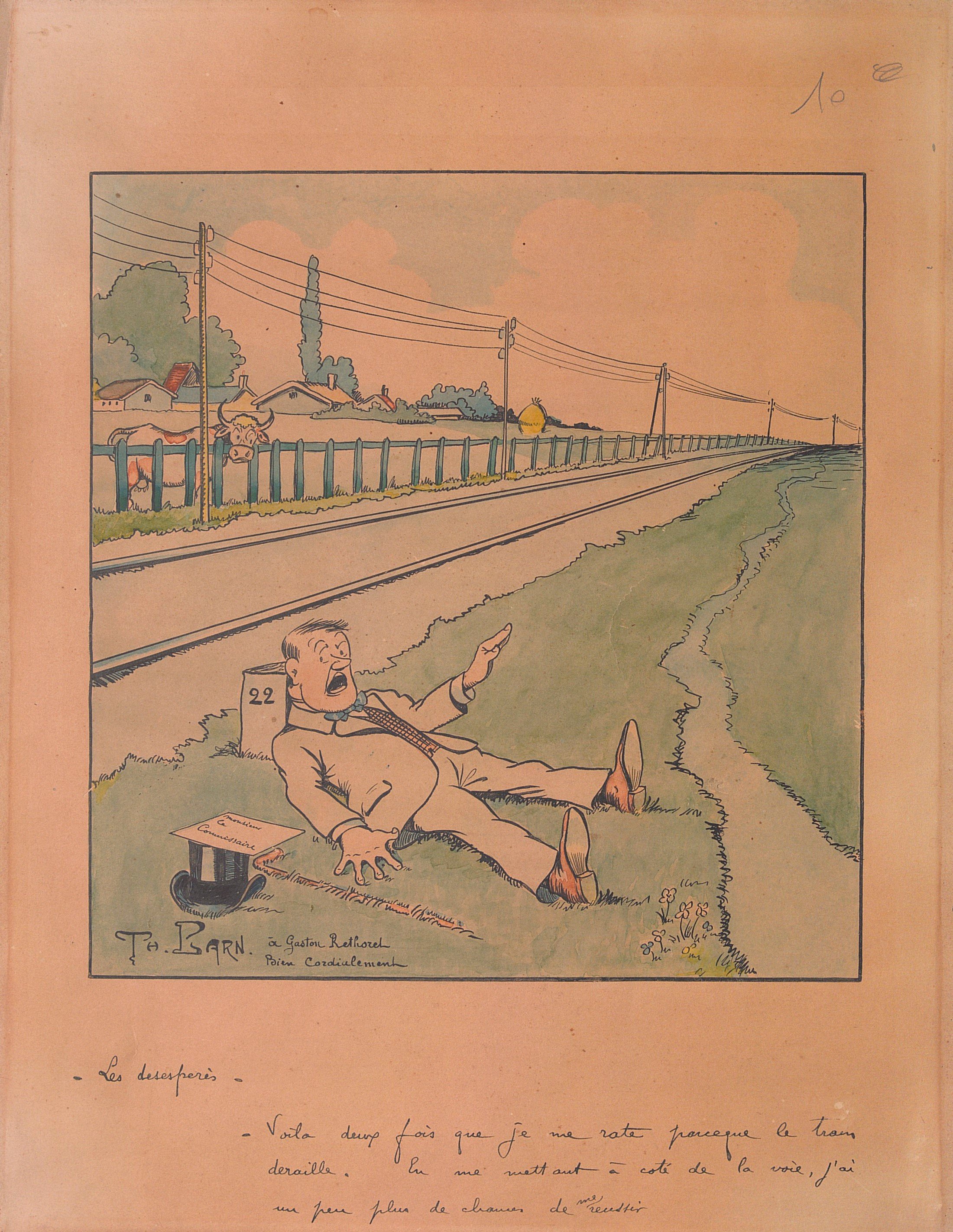 Julien Lagrange dit Th. Barn (Orléans, 1876-1939), Les désespérés, encre et aquarelle, signé, avec dédicace et légende à la plume: « Voilà deux fois que je me rate parce que le train déraille. En me mettant à côté de la voie, j’ai un peu plus de chances de me réussir », 39,5 x 30,5 cm ;