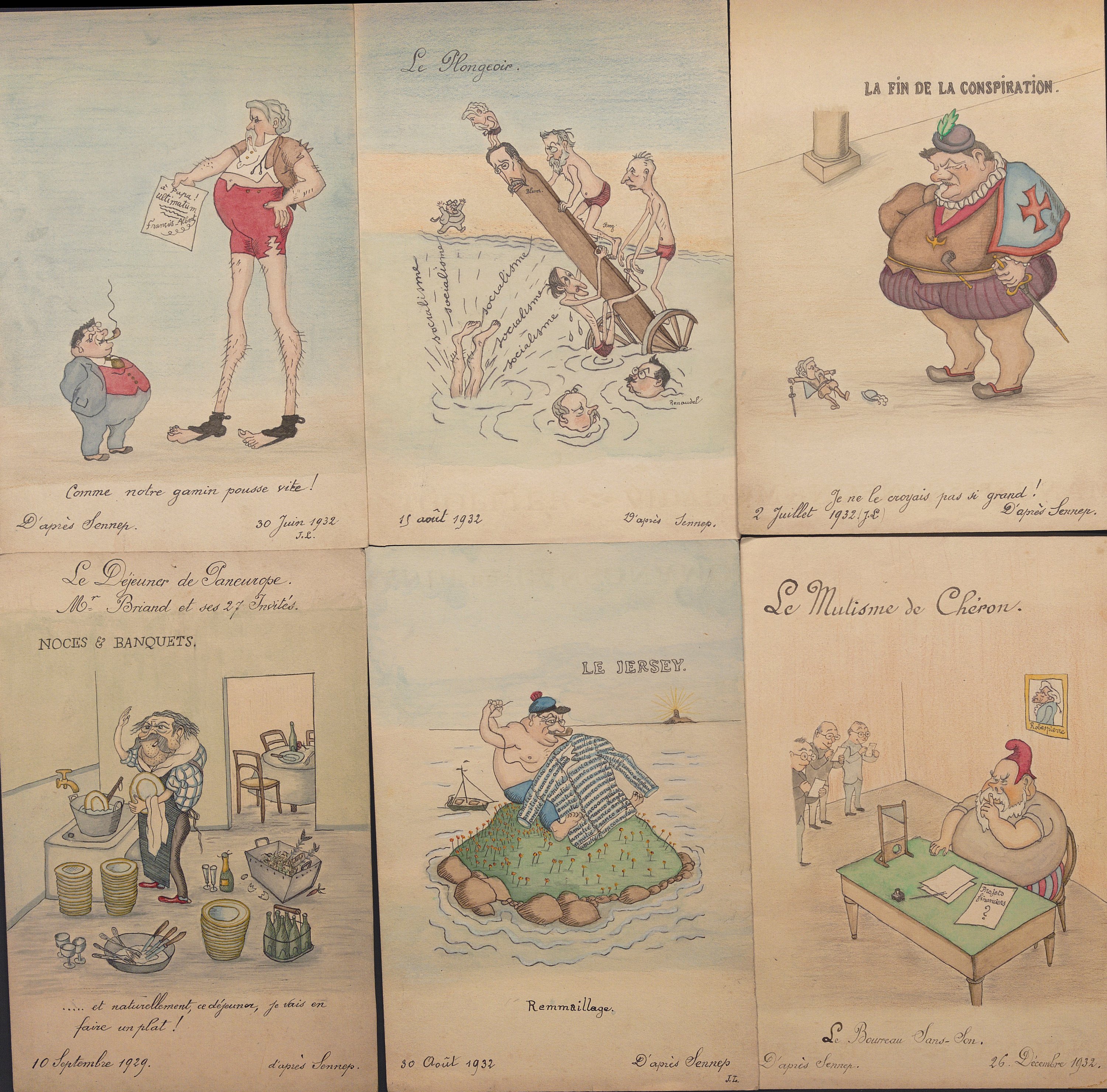 Réunion de 29 dessins originaux sur papier, encre et aquarelle, signés J. Lassalle, env. 14 x 20 cm, d’après le dessinateur de presse et caricaturiste Jean Sennep ; scènes humoristiques extraits de journaux d’époque publiés entre 1926 et 1933, dont: Le Pèlerin reste ; La Périssoire ; Le Réveil ; Au manège Huyghens ; Etrennes ; Le successeur ; Le Plongeoir ; etc.