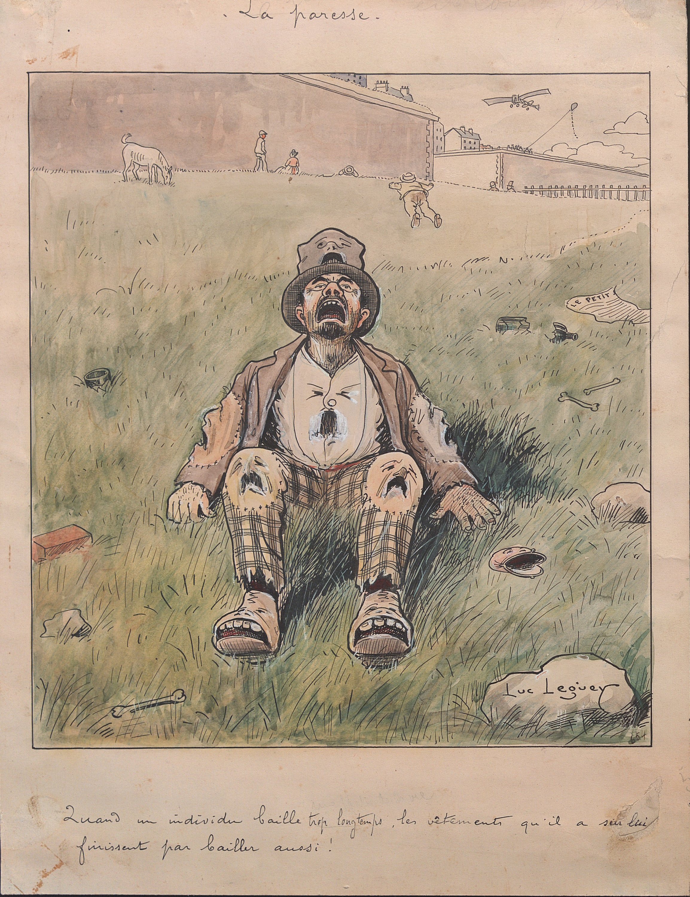 La paresse, encre, aquarelle et gouache, signé en bas à droite, titré et légendé « Quand un individu baille trop longtemps, les vêtements qu’il a sur lui finissent par bailler aussi! », 33,5 x 26 cm ;