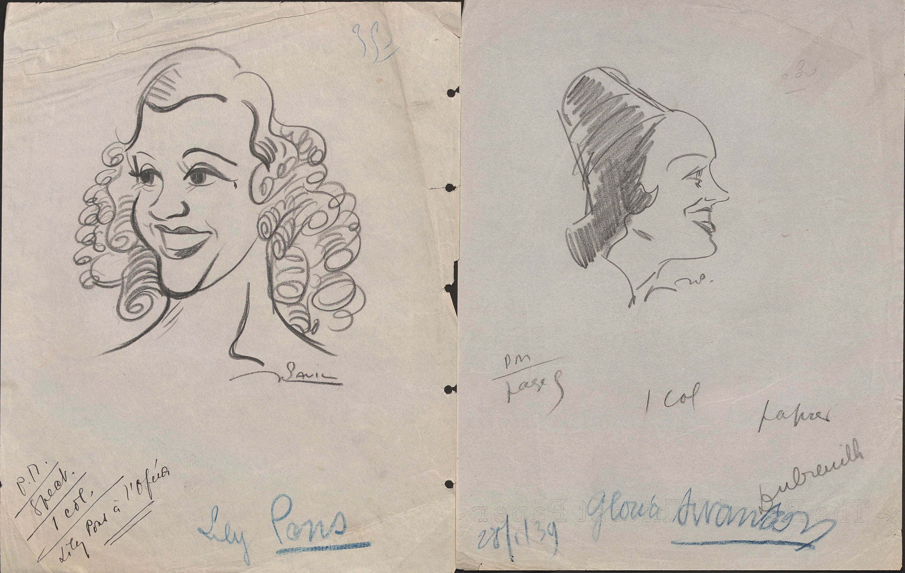 Portraits de personnalités, encre de chine et crayon, sur papier et calque, en majorité signés, formats divers, destinés à être publiés à la rubrique Les Spectacles du journal quotidien Paris-midi.