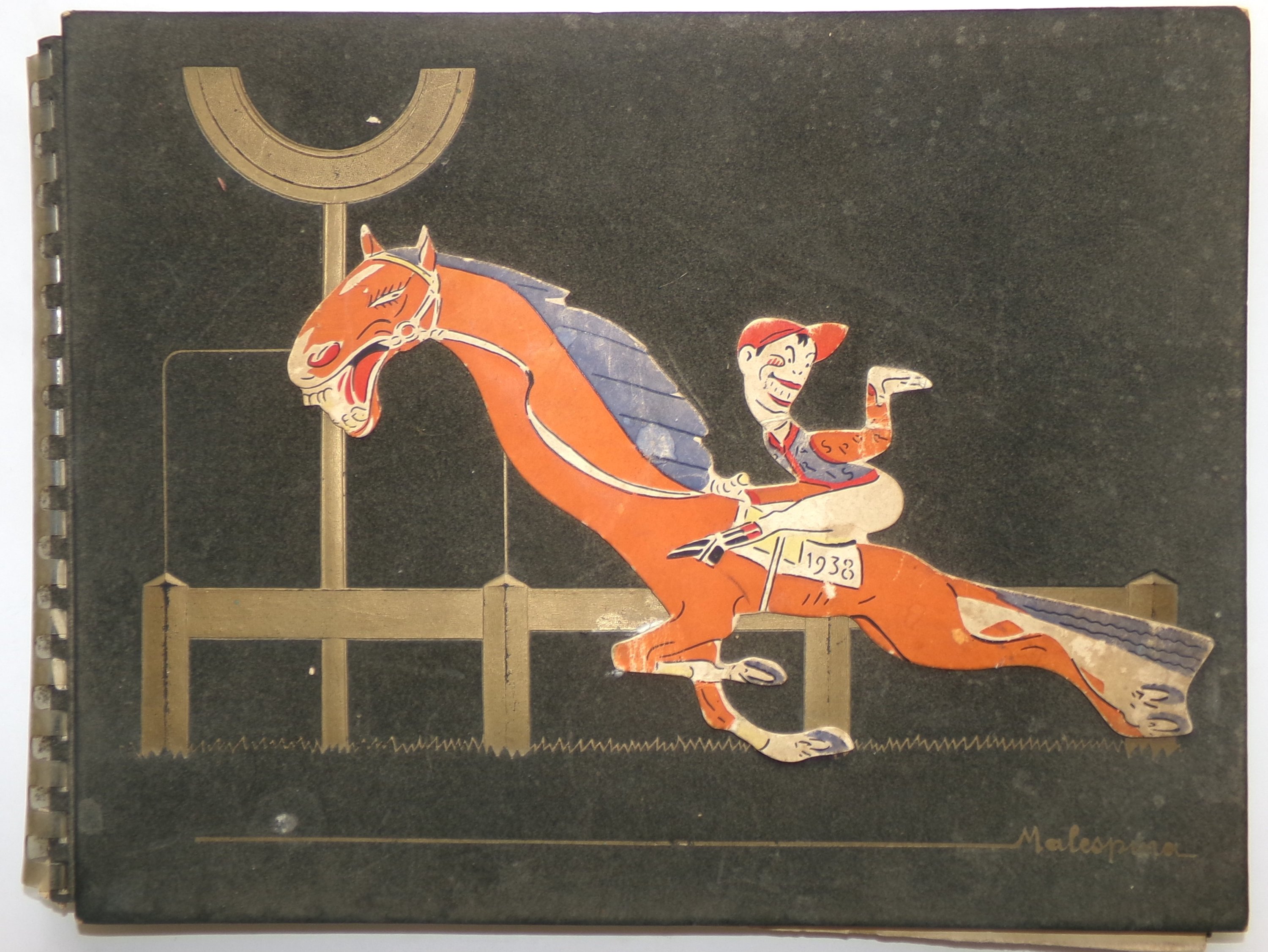 Album du gala des courses 1938. Paris, Lahure, 1938. In fol. oblong, cartonnage couvert de feutre noir, orné au premier plat d’un dessin sérigraphié de Malespina. Livre d’or édité à l’occasion du Gala des Courses organisé le 17 Juin 1938 au Théatre Marigny par le journal Paris Sport, illustré de 30 dessins humoristiques pleines pages avec le gracieux concours des dessinateurs: BIB, R. Carrizey, Chaurand Naurac, Don, Jean Effel, Raoul Guérin, Malespina, Raymond Pallier.