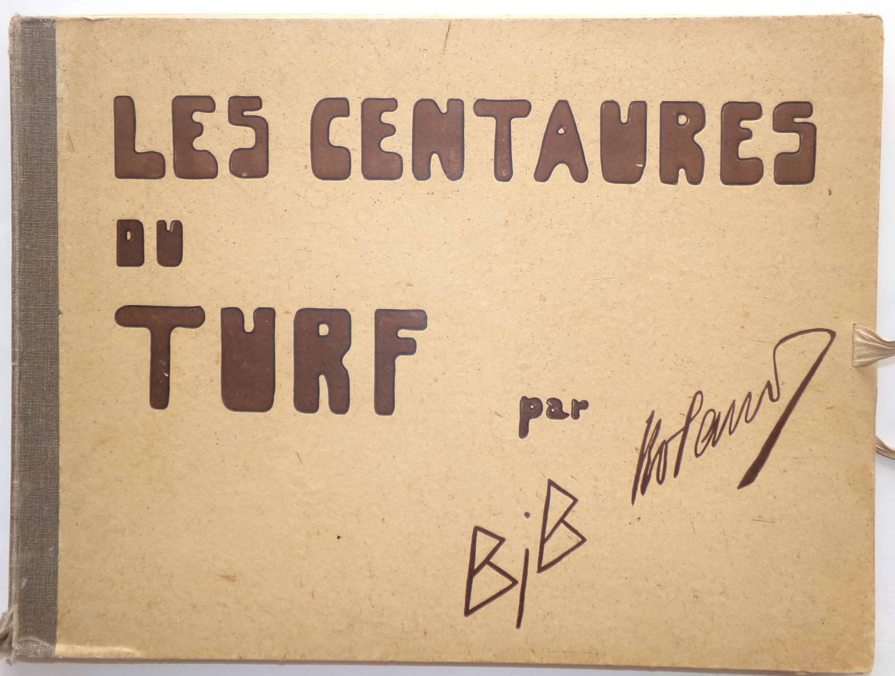 Georges Auguste Breitel dit Bib, et Roland, Les Centaures du turf. Paris, Nouvelle édition française, 1931. Etui in-folio illustré à rabats à l'italienne contenant 32 planches de caricatures impr. de Bib et Roland de personnalités du monde des courses. n°418/700 ex. sur vélin de Navarre ;
