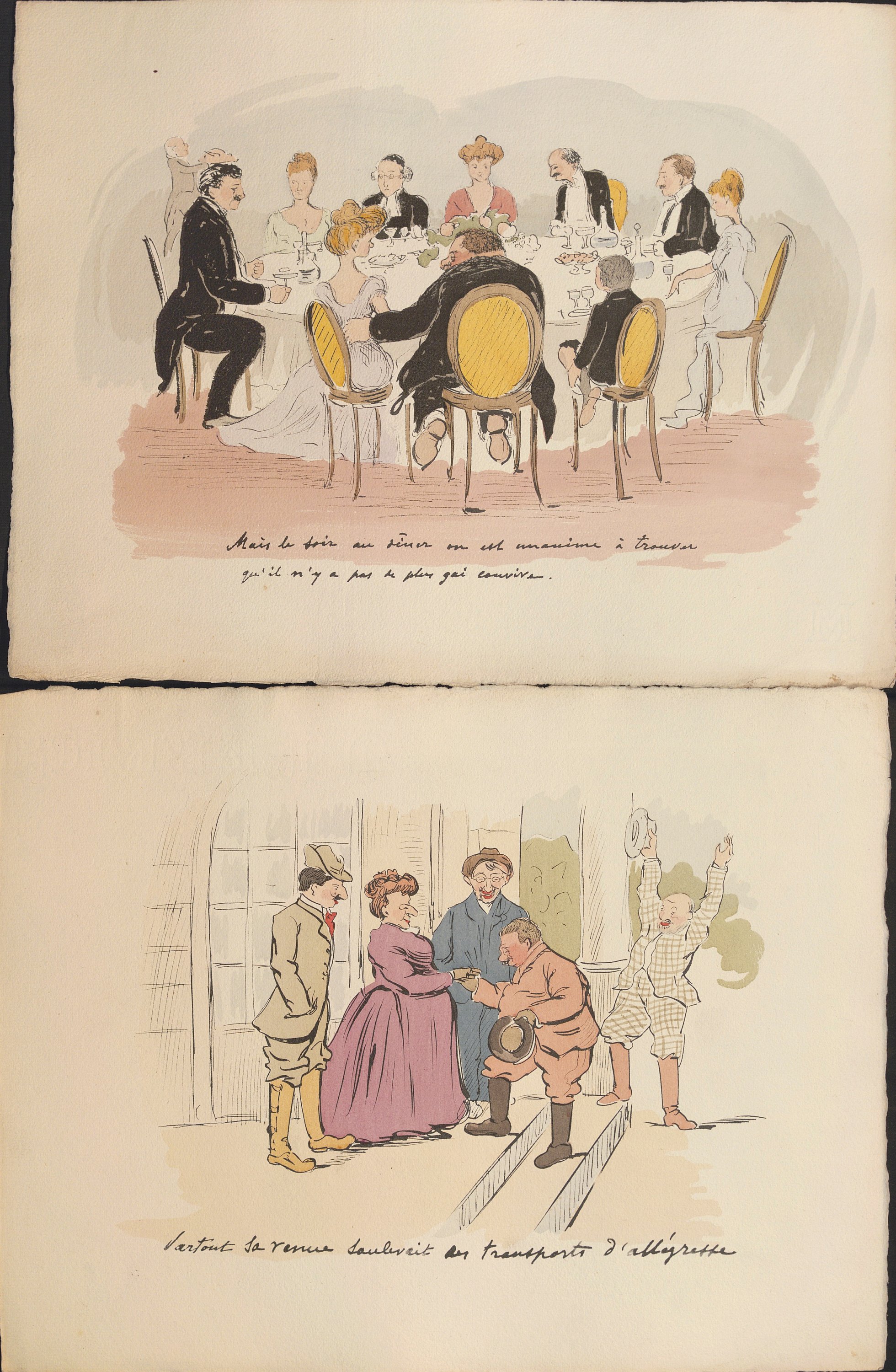Suite de 9 scènes humoristiques gravées et coloriées au pochoir d’époque, légendées, années 1910-1920, 25 x 32 cm ;