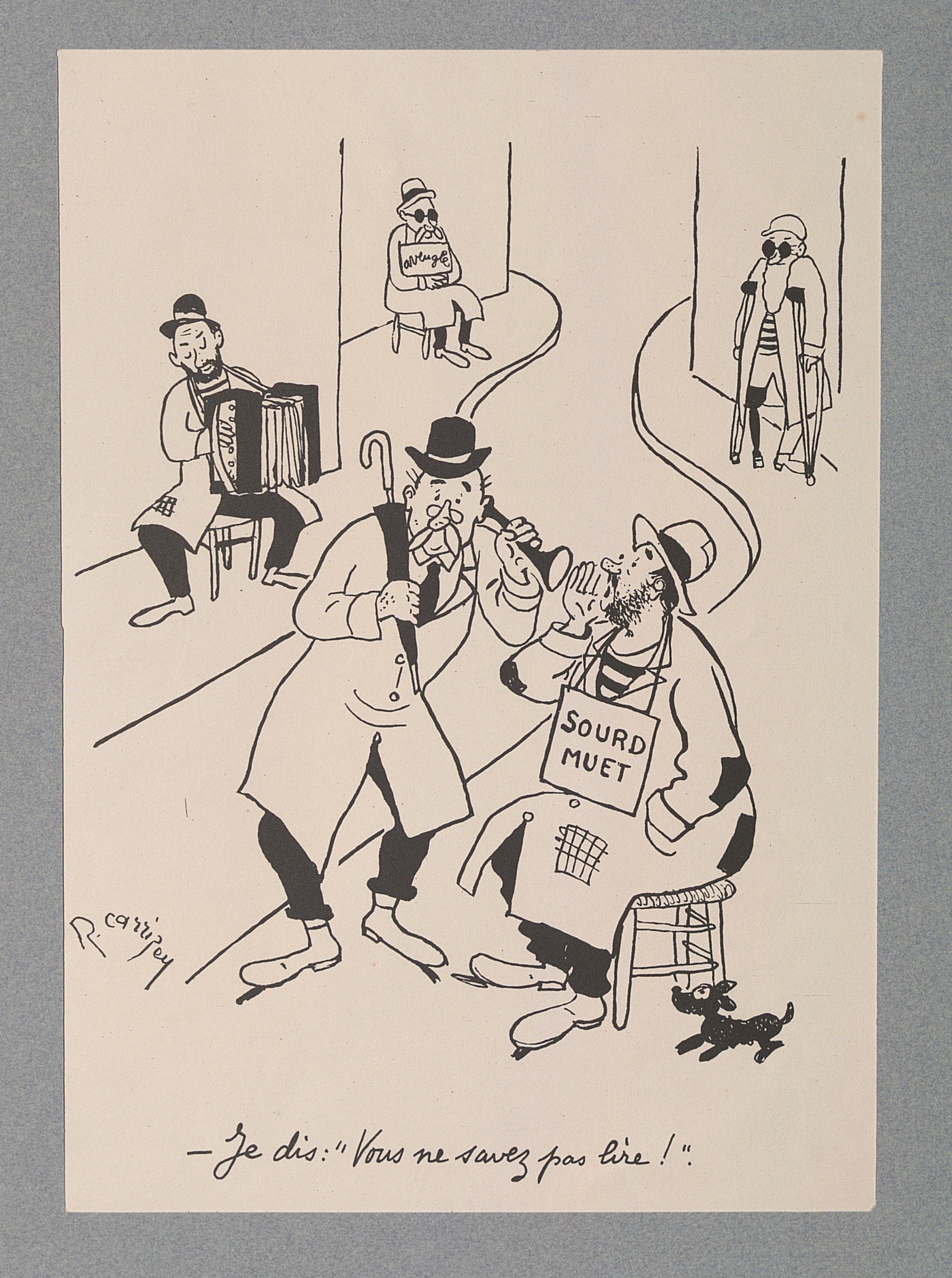 Pardon, la zone des armées SVP, légendé au crayon ; L’accident de voiture, légendé à l’encre ; L’orchestre symphonique, légendé à l’encre ; Le dialogue de sourd, légendé à l’encre ; Le bûcheron, légendé à l’encre.