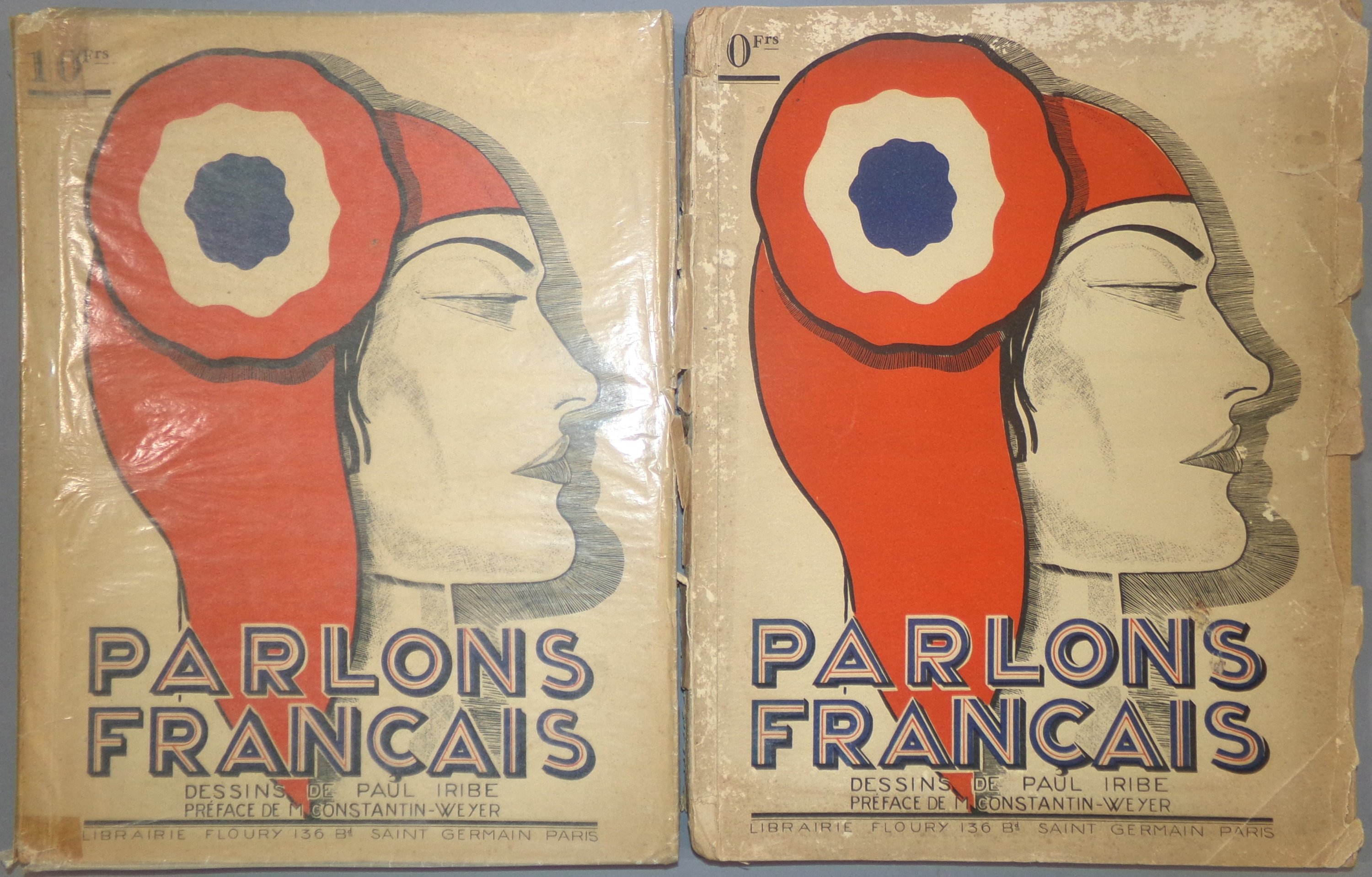 Parlons français. Dessins de Paul Iribe. Préface de Maurice Constantin-Weyer. Paris, Floury, 1934. In-folio broché. Edition originale de 37 illustrations en couleurs dont plusieurs à double page. Bel exemplaire (un peu jauni).
