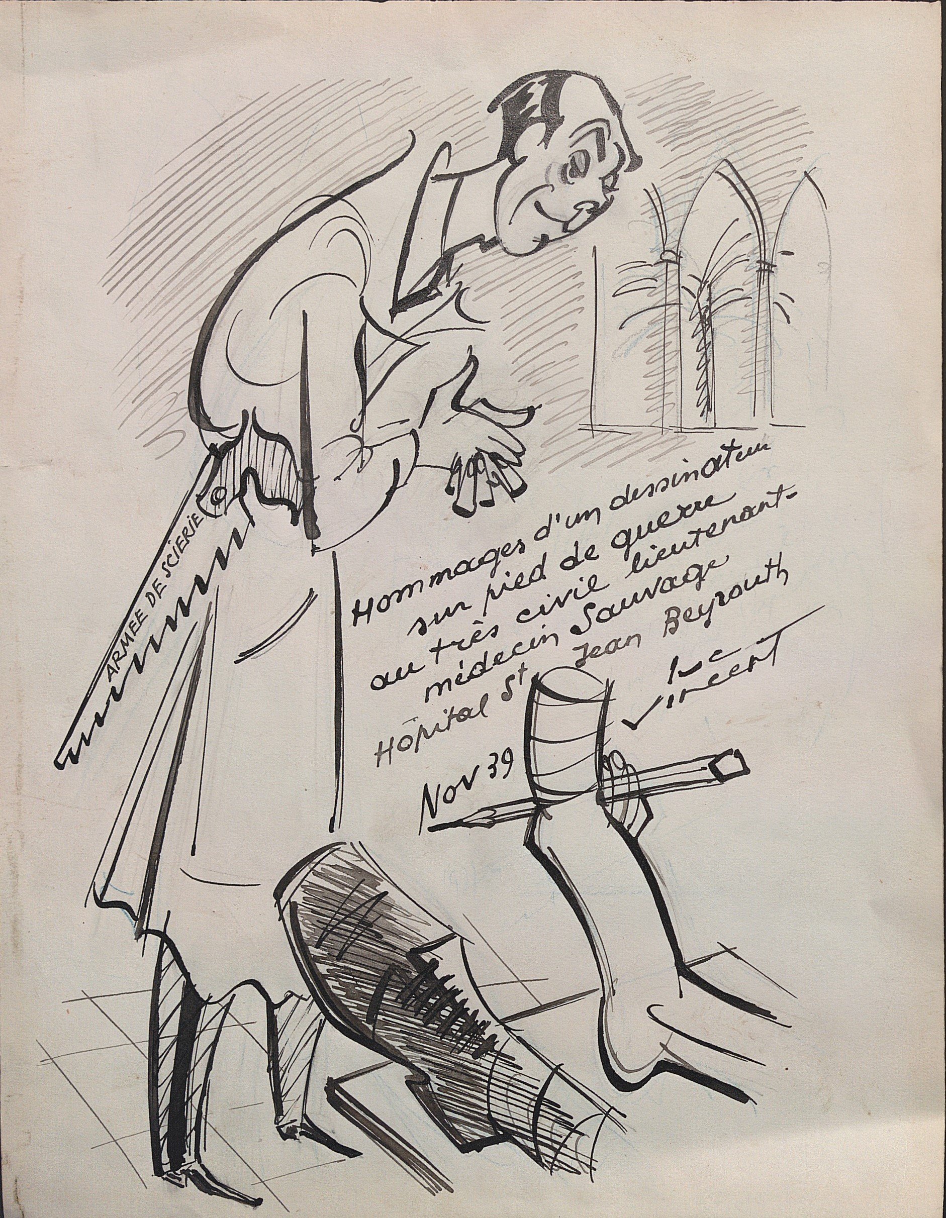 « Armée de Scierie, hommages d’un dessinateur sur pied de guerre, hôpital Saint Jean Beyrouth », encre, datée et signée, 33,5 x 26 cm ;