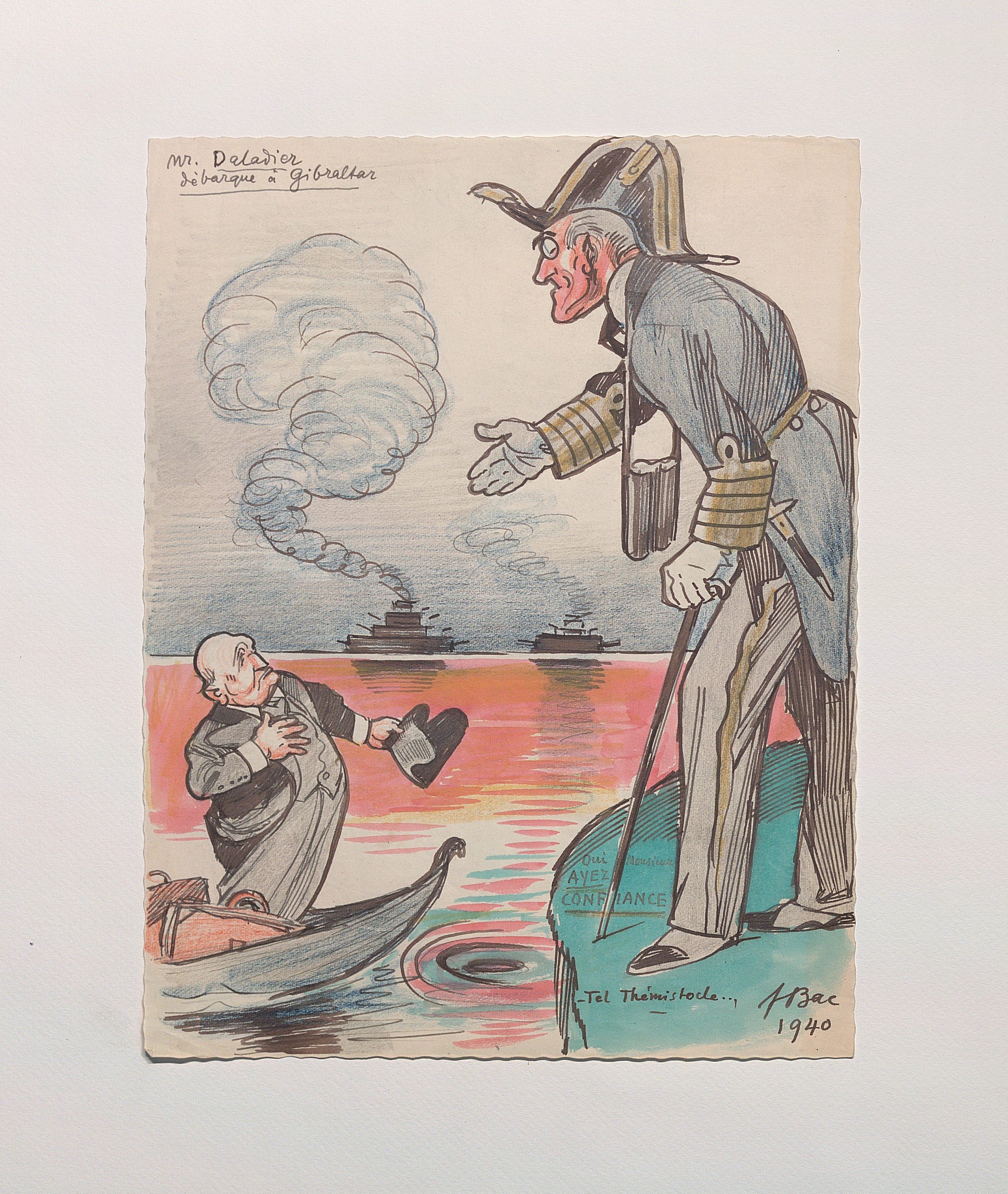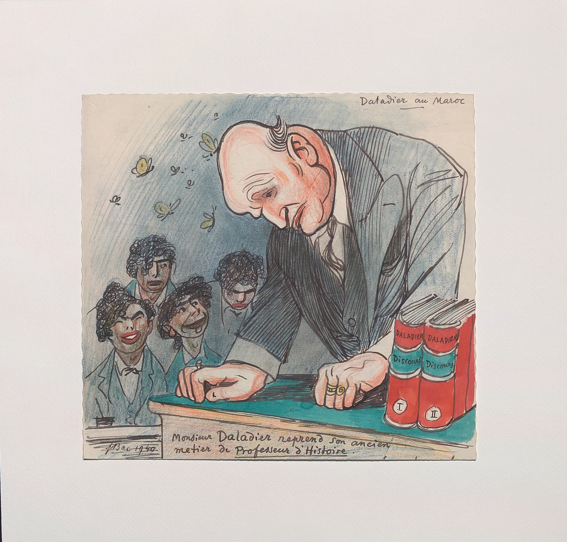 4 dessins relatifs au séjour au Maroc en juin et juillet 1940 d’Edouard Daladier, ancien président du Conseil, encre, aquarelle, gouache et crayons de couleurs, sur papier contrecollés sur carton, tous signés, datés « 1940 » et légendés, 27 x 21 cm ; face à la débâcle de l’armée française, 27 parlementaires décident de quitter la France en juin 1940 à bord du paquebot le Massilia pour rejoindre Casablanca au Maroc. De retour en France au début d’août 1940, Daladier est arrêté par le gouvernement de Vichy et transféré à Buchenwald ;