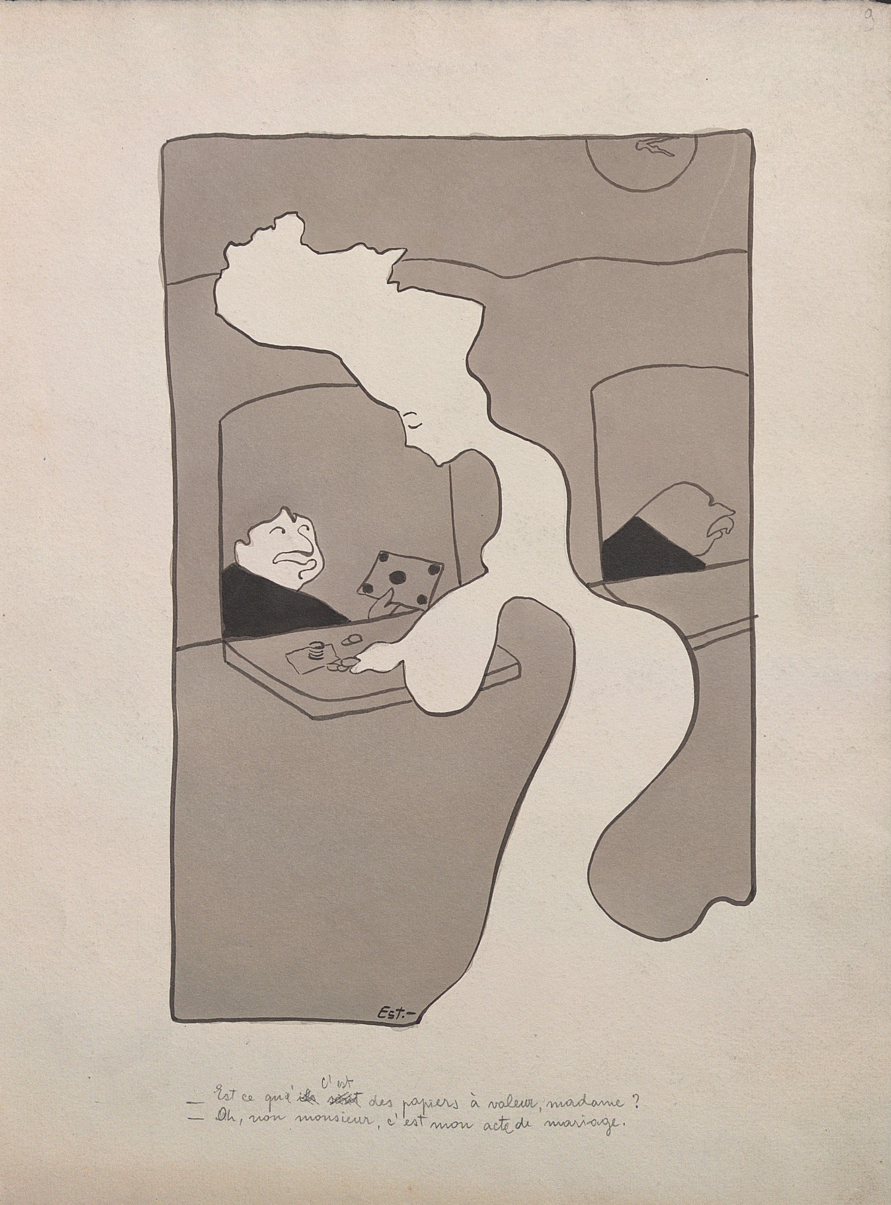 Toby Schoyer, sans titre, encre, signé en bas à droite et daté 1954, légendé en anglais, 21 x 15 cm ;