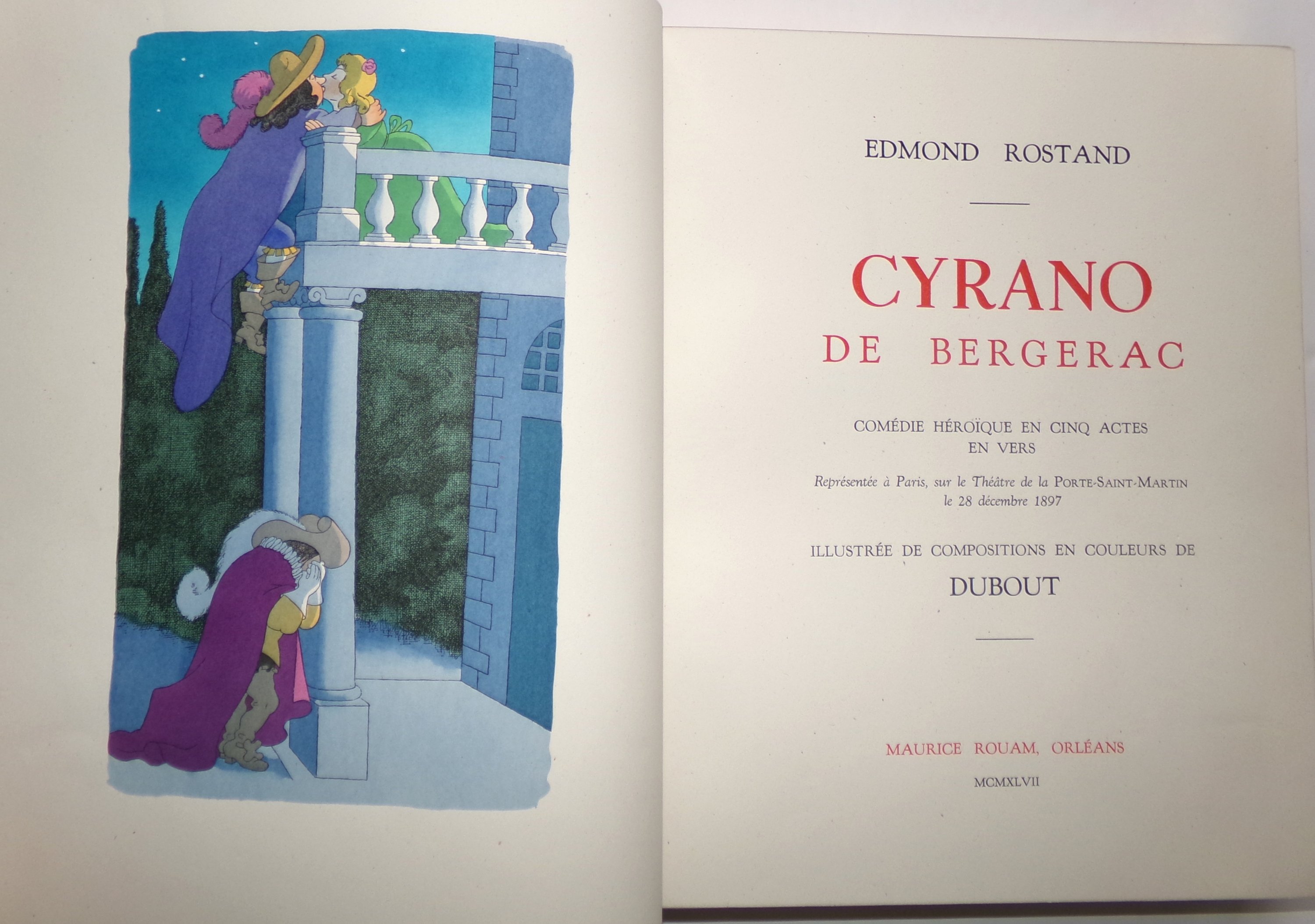ROSTAND (Edmond), DUBOUT (Albert). Cyrano de Bergerac. Comédie héroïque en cinq actes en vers, représentée à Paris, sur le Théâtre de la Porte-Saint-Martin le 28 décembre 1897. Illustrée de compositions en couleurs de Dubout. Orléans, Rouam, 1947. Grand in-4 superbe reliure et étui, ex-libris G. Albouy. Tirage limité à 1636 ex. num. 791/1500 Rives blanc.