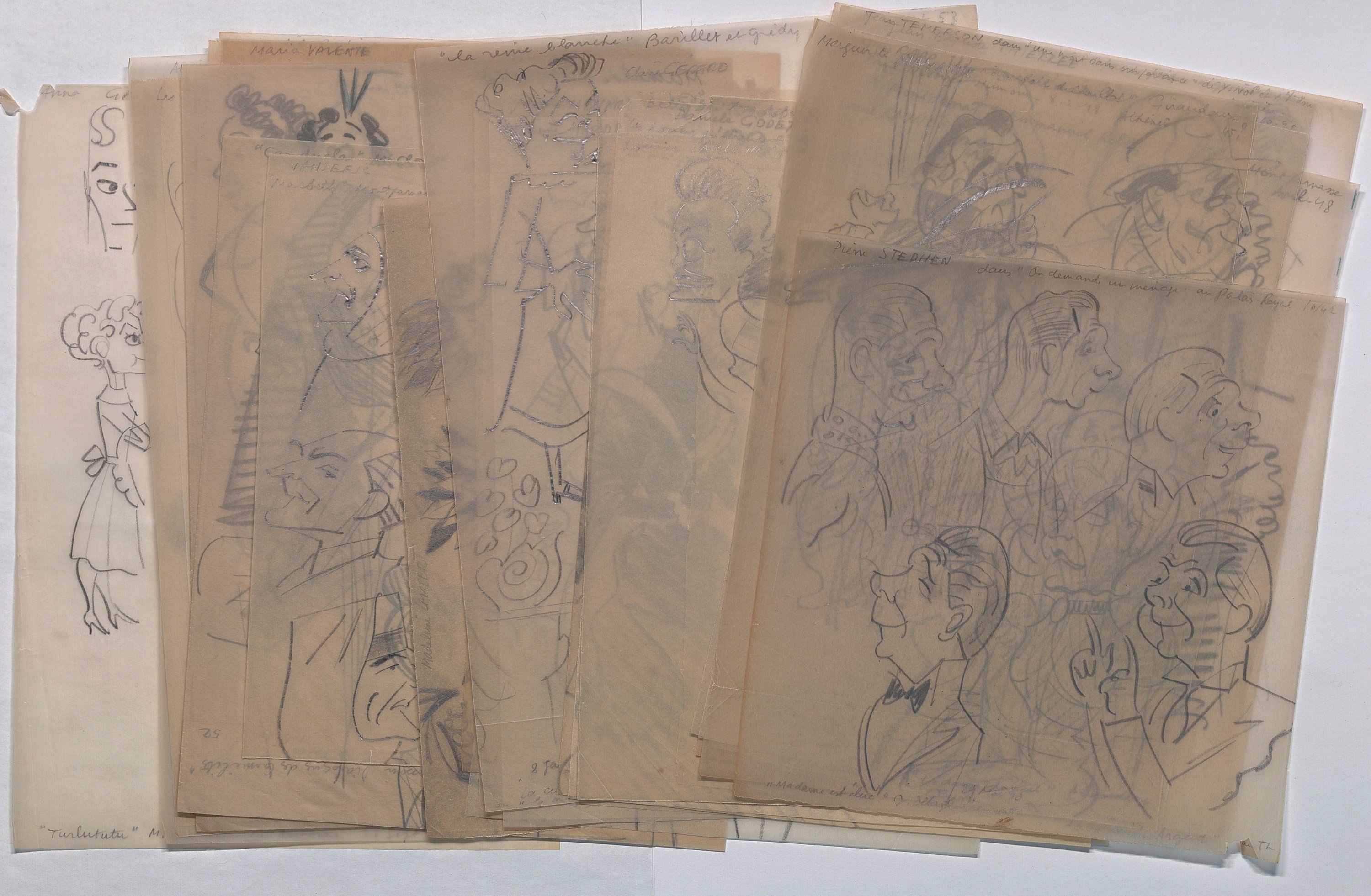 Réunion d’env. 175 calques, env. 30 x 21 cm, sur lesquels sont reproduits au crayon, certains à rehauts de couleurs, de multiples portraits caricaturés de personnalités majoritairement issues du monde du théâtre et du monde politique, années 1940-1970, légendés et datés. Ce rare ensemble de dessins pourrait être attribué à Luc Vincent, connu pour ses nombreux caricaturés du monde du spectacle, du sport et de la politique, illustrant de nombreux journaux d’après-guerre.