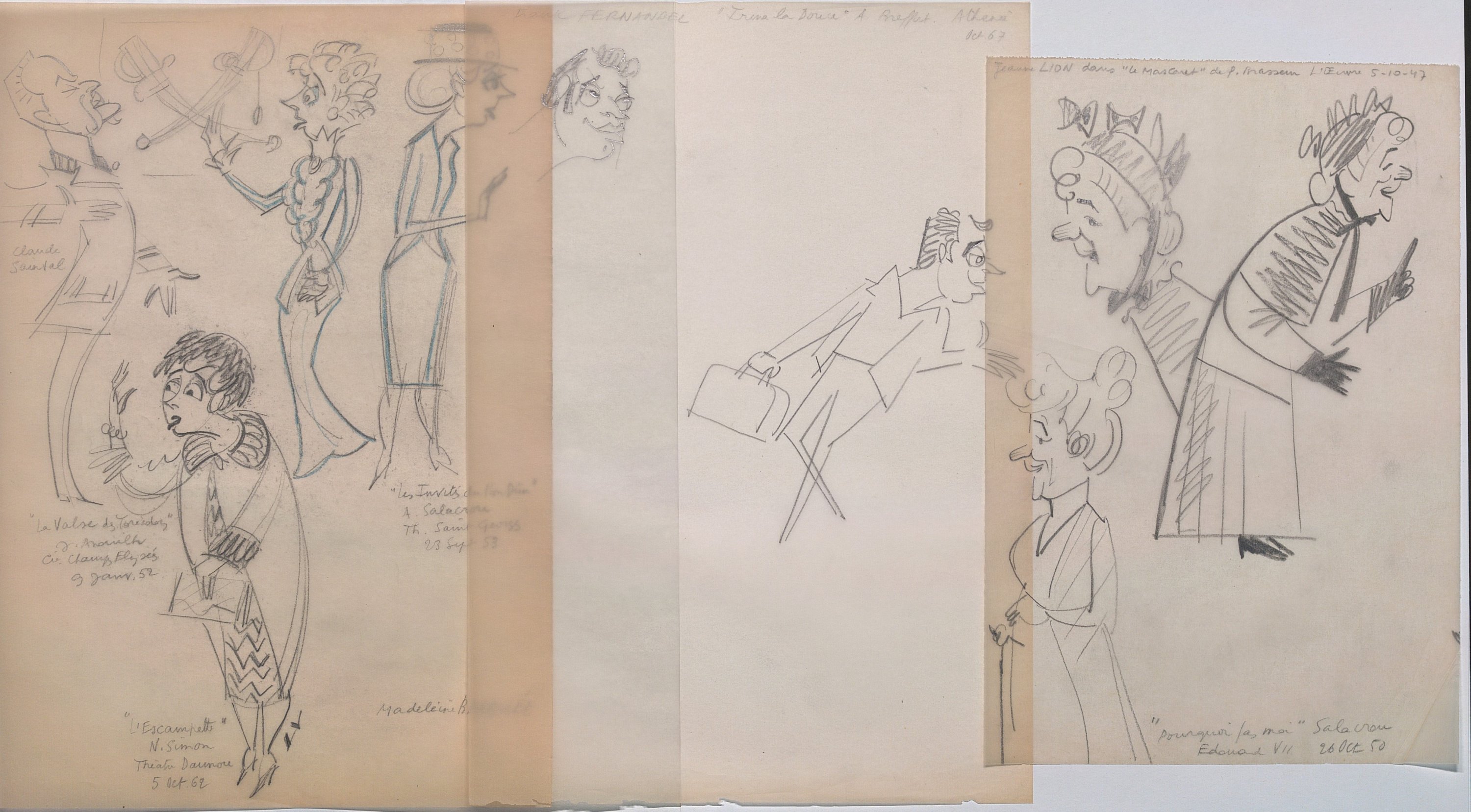La plupart des croquis caricaturent des comédien/nes en représentation dans les théâtres parisiens (Michodière, Vieux Colombier, Capucines, La Coupole, Madeleine, Marigny, Renaissance, Folies bergères, Montparnasse, Mathurins, Athénée, etc).
