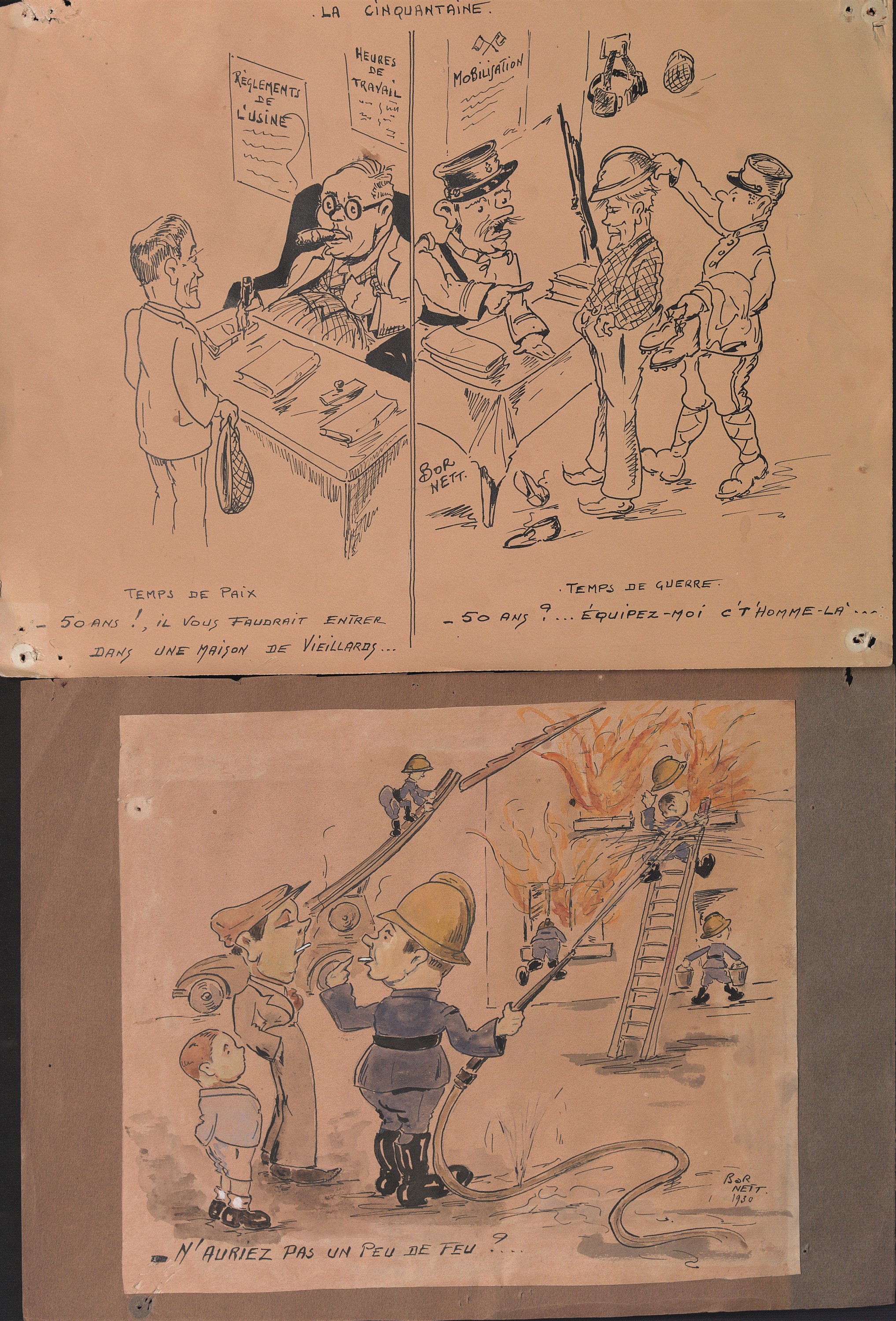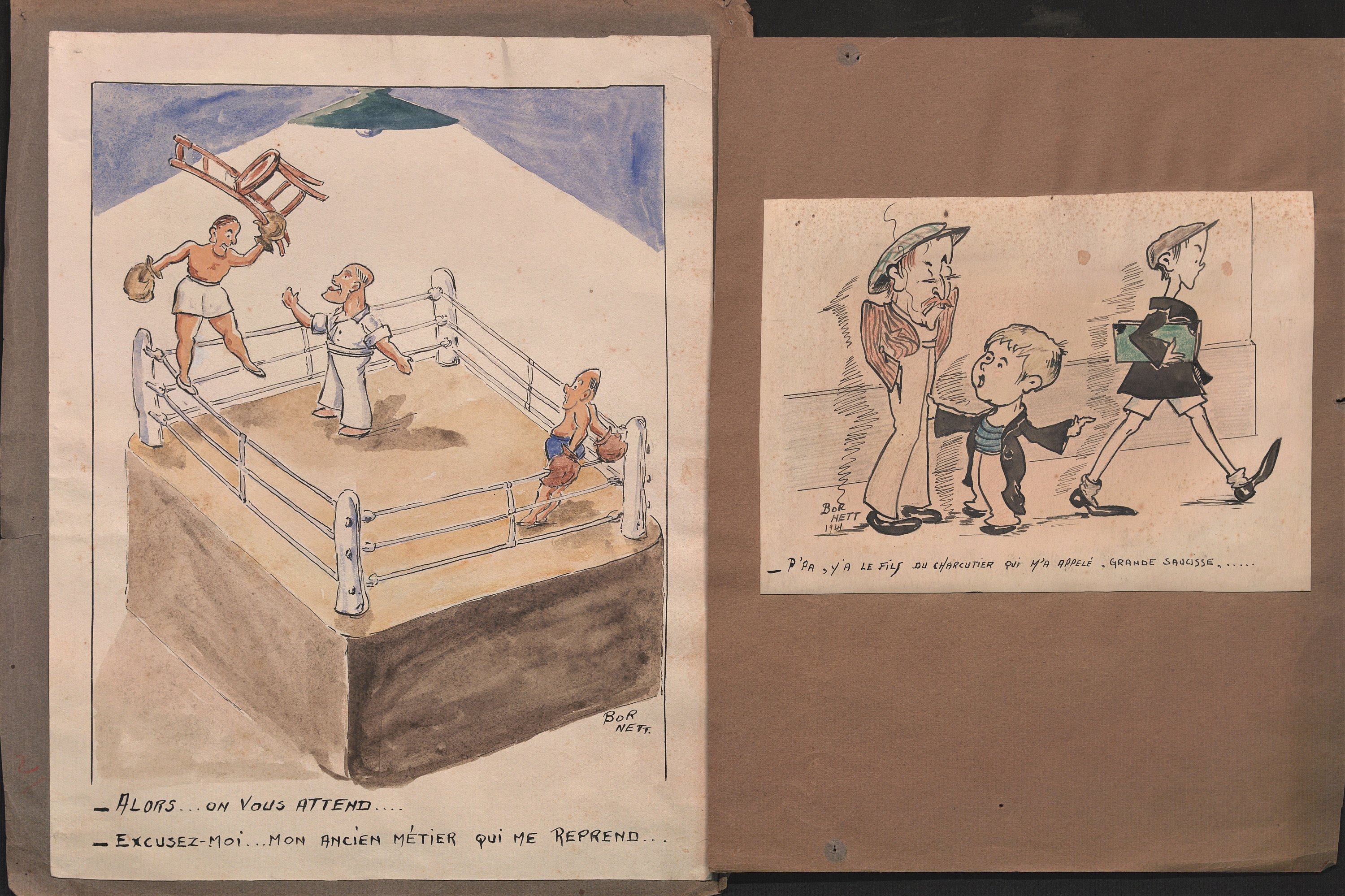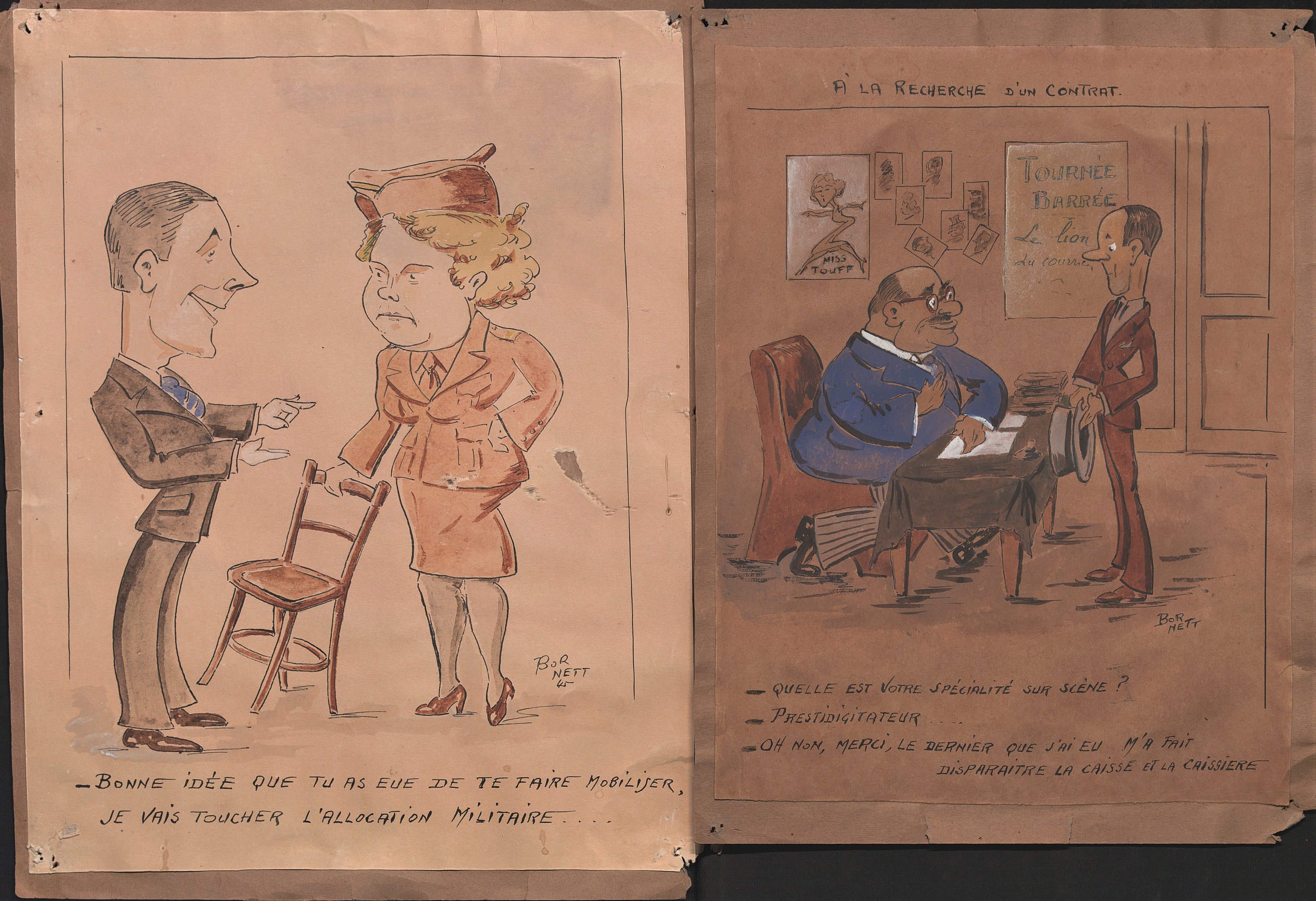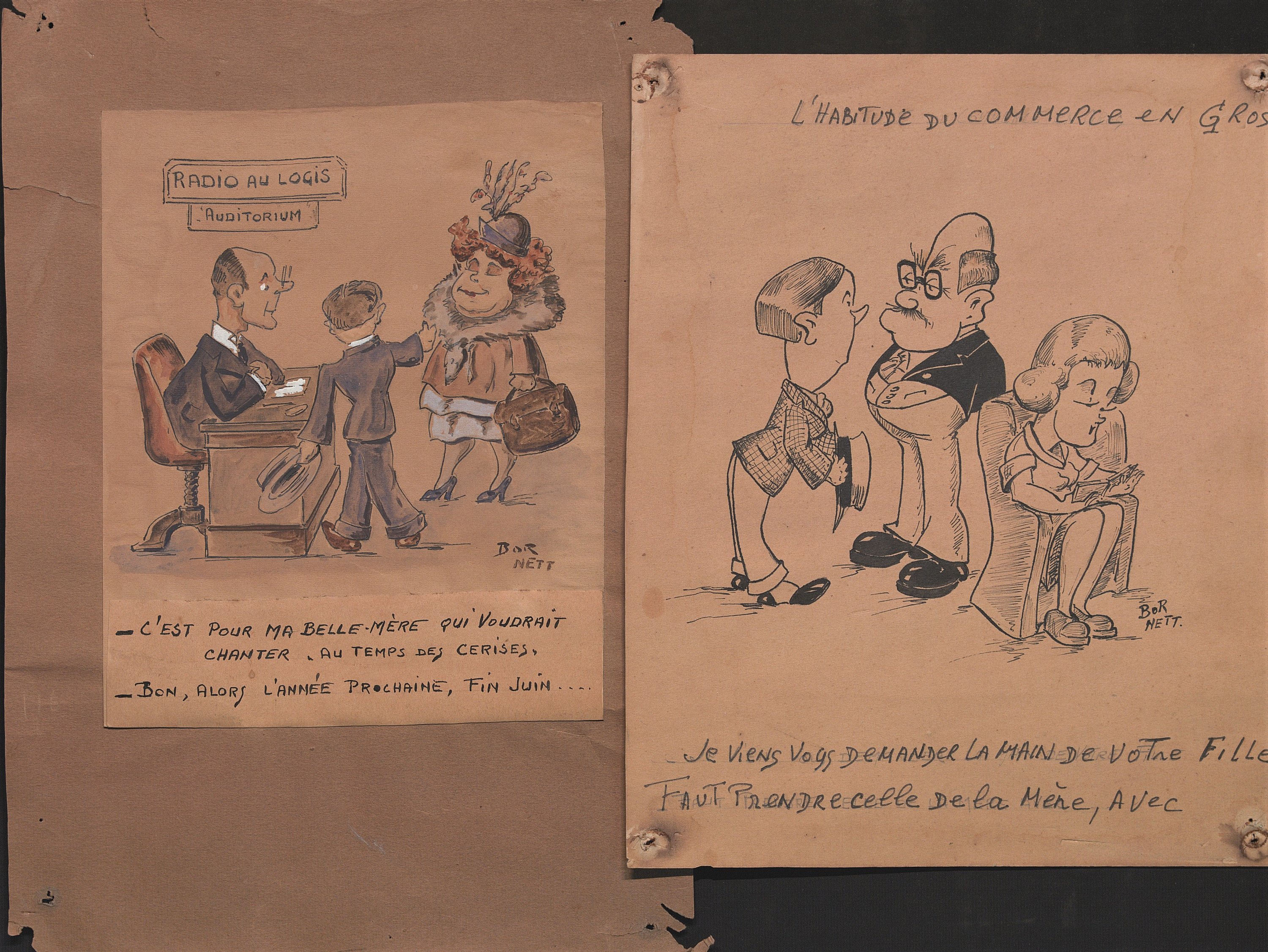 Qualifié dans la presse de la fin des années 1930 de chanteur caricaturiste humoriste des cabarets de la Butte, le Musée d’histoire contemporaine conserve une soixantaine de dessins humoristiques dont caricatures d’Adolf Hitler dit Dodoff, Joseph Darnand, Pierre Laval, etc.