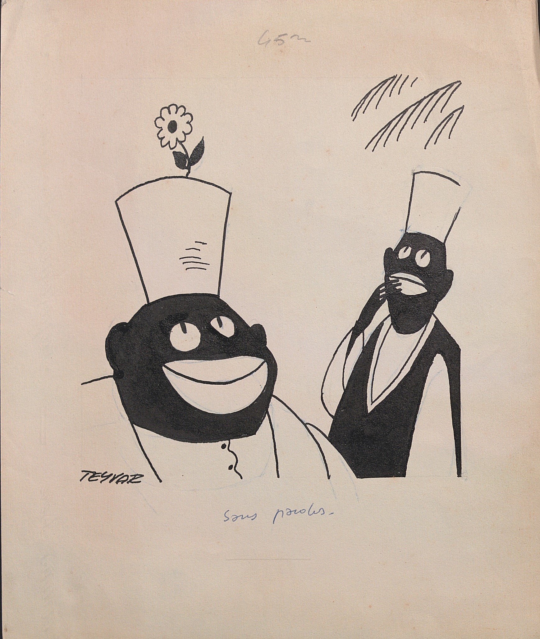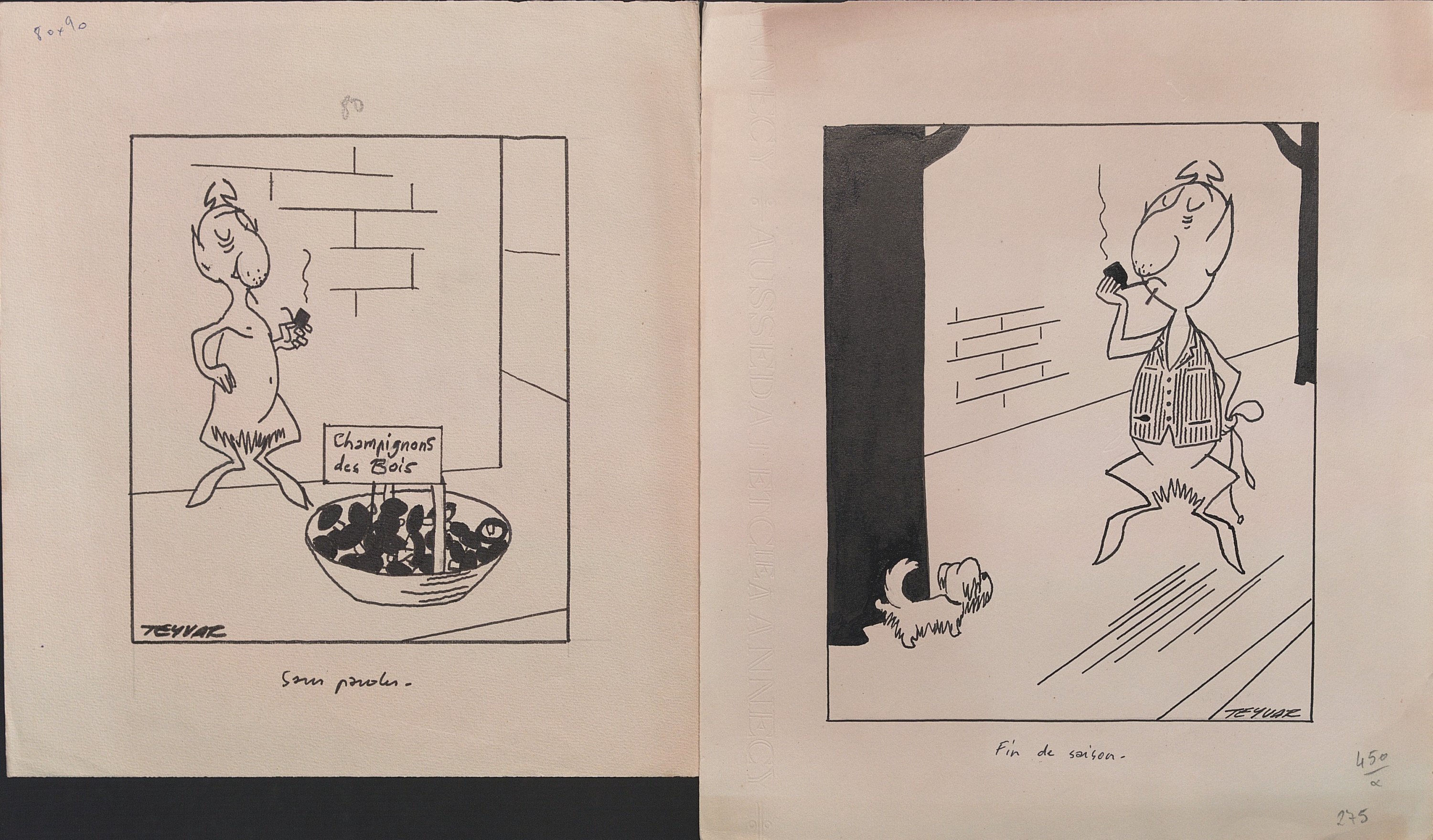 17 dessins de presse humoristiques et satiriques, encre, sur papier épais, signés, certains légendés, formats divers, dont: M.L.F. vaincra [Mouvement de libération des femmes], légendé au crayon « Citoyennes, vous avez déjà conquis le pantalon ne vous arrêtez pas en si bon chemin », 25,5 x 19 cm ; « J’ai ma petite idée sur le rapprochement œcuménique », 21,5 x 23 cm ; « Pile, je me marie face, je reste célibataire », 29 x 5 cm ; « Mort aux Vaches », 26 x 24 cm ; « Je voudrais tirer un petit coup », 25 x 28,5 cm ; « Vous voulez vraiment que je mette quelque chose dans votre cheminée? », 23,5 x 24 cm ; « Fin de saison », 28,5 x 25 cm ; portrait-charge de Gilbert Montagné, Dalida ; etc.