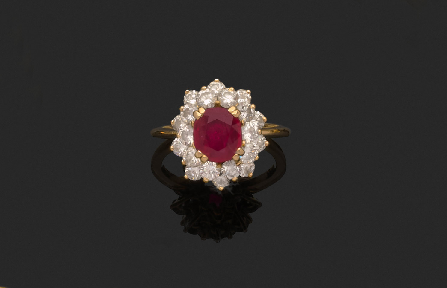 Or jaune 750 millièmes, ornée au centre d'un rubis traité dans un double entourage de diamants ronds de taille brillant d'environ 1,80 à 2,20 cts.