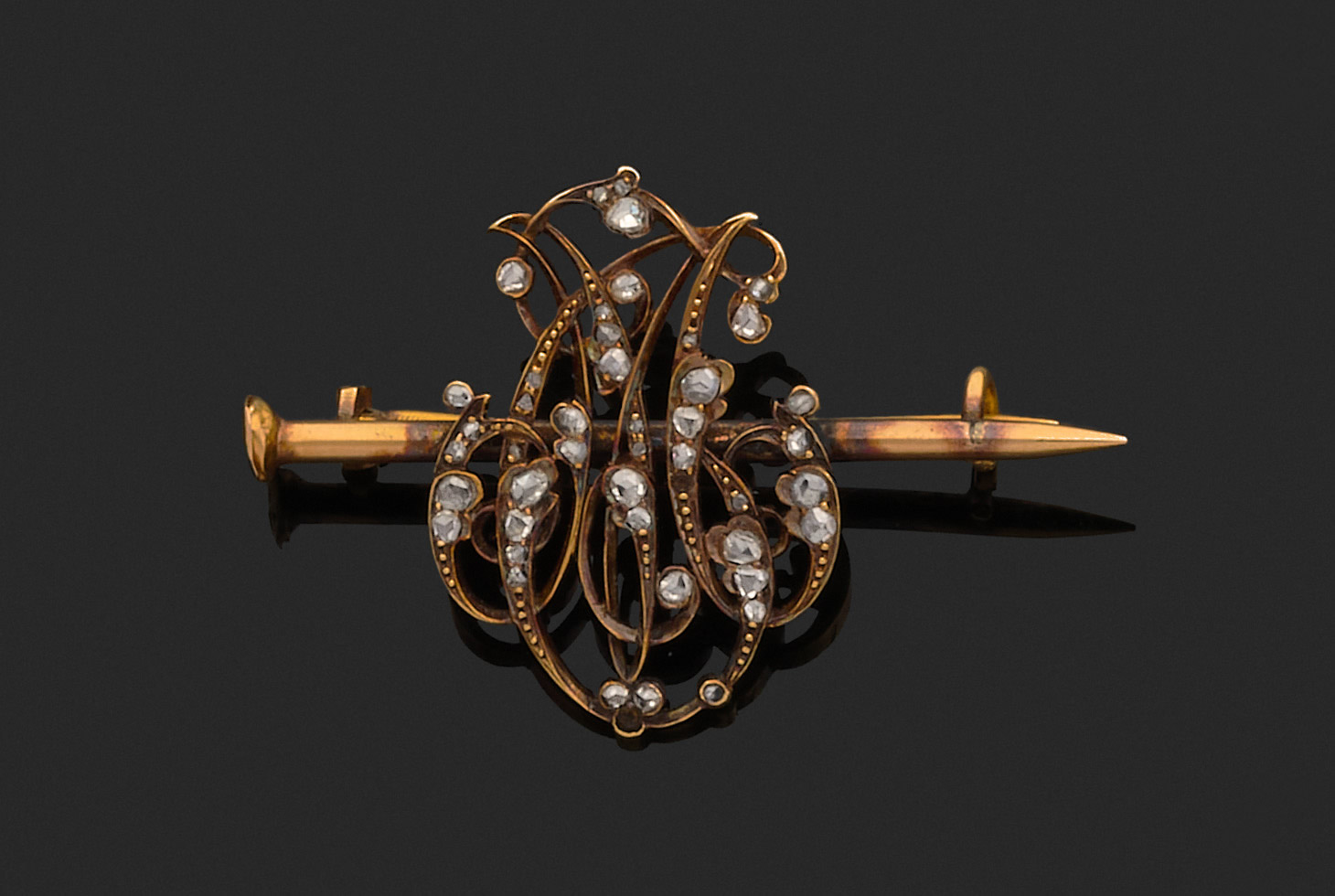Or jaune 750 millièmes, le centre décoré d'un monogramme serti de diamants taillés en rose.