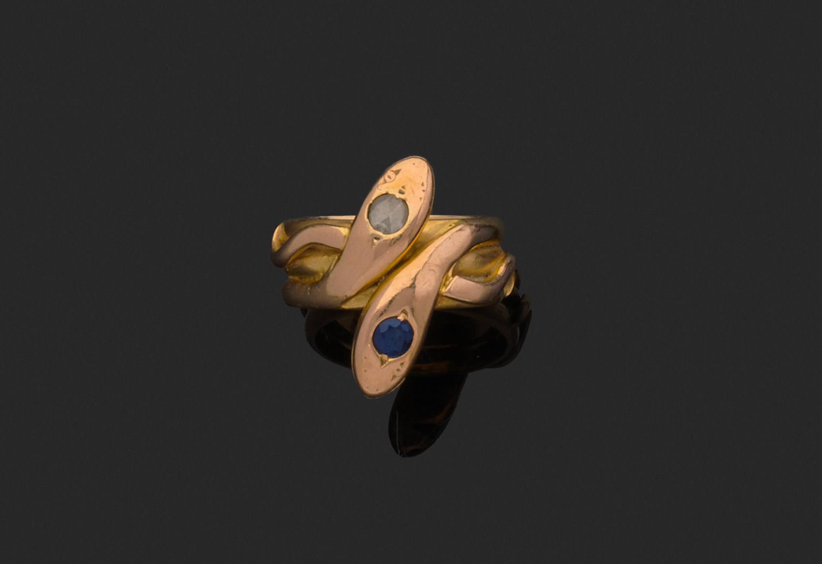 Or jaune 750 millièmes, figurant deux serpents enroulés, les têtes ornées d'un saphir ou d'un diamant taillé en rose.