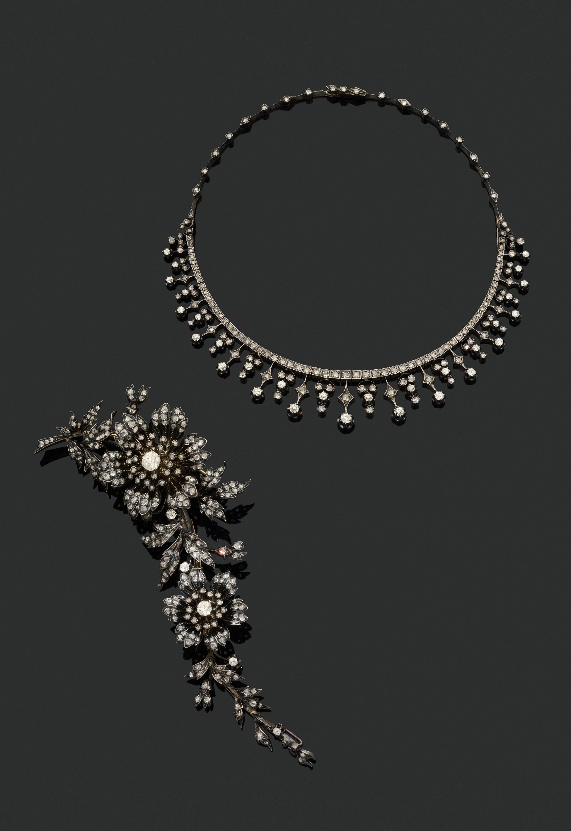 - Collier articulé en or 750 millièmes et en argent 800 millièmes, entièrement serti de diamants taillés en rose, la partie centrale amovible décorée de motifs en chute ornés de diamants taillés en rose et ronds de taille ancienne, dont 15 diamants d'environ 0,05 à 0,25 ct chacun.