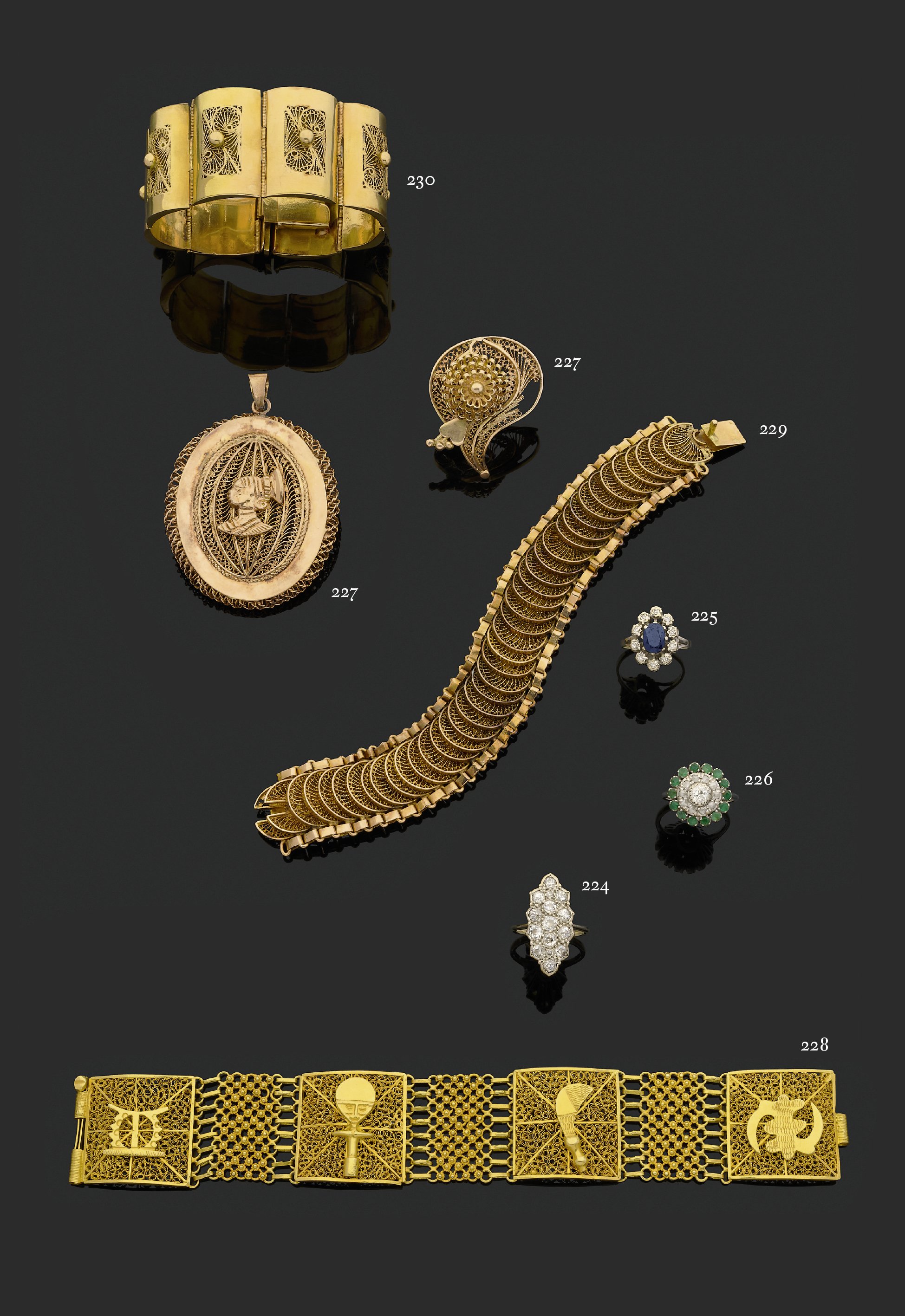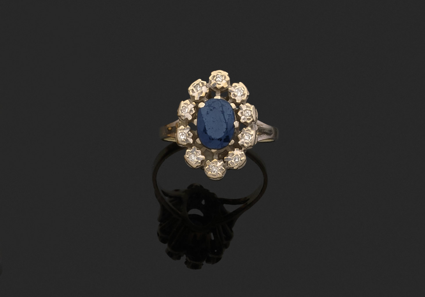 Or gris 750 millièmes, ornée au centre d'un saphir ovale dans un entourage de dix diamants ronds taillés en huit-huit.