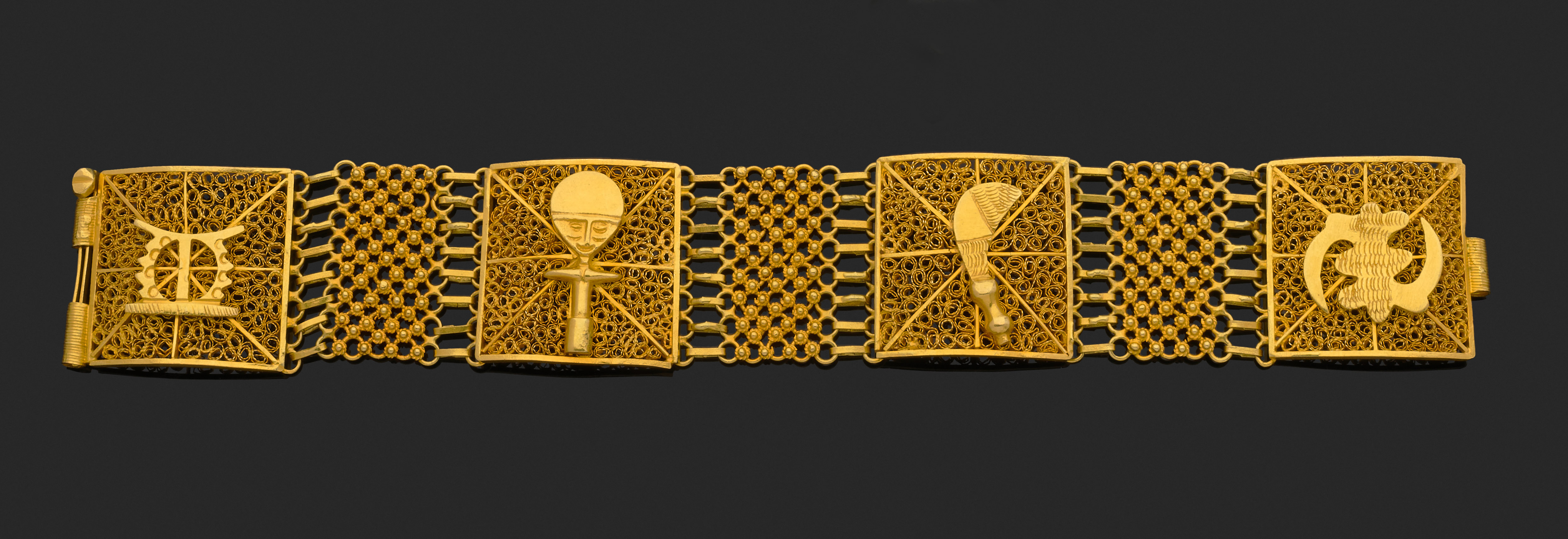 Or jaune 585 millièmes, composé de quatre motifs filigranés décorés de symboles.