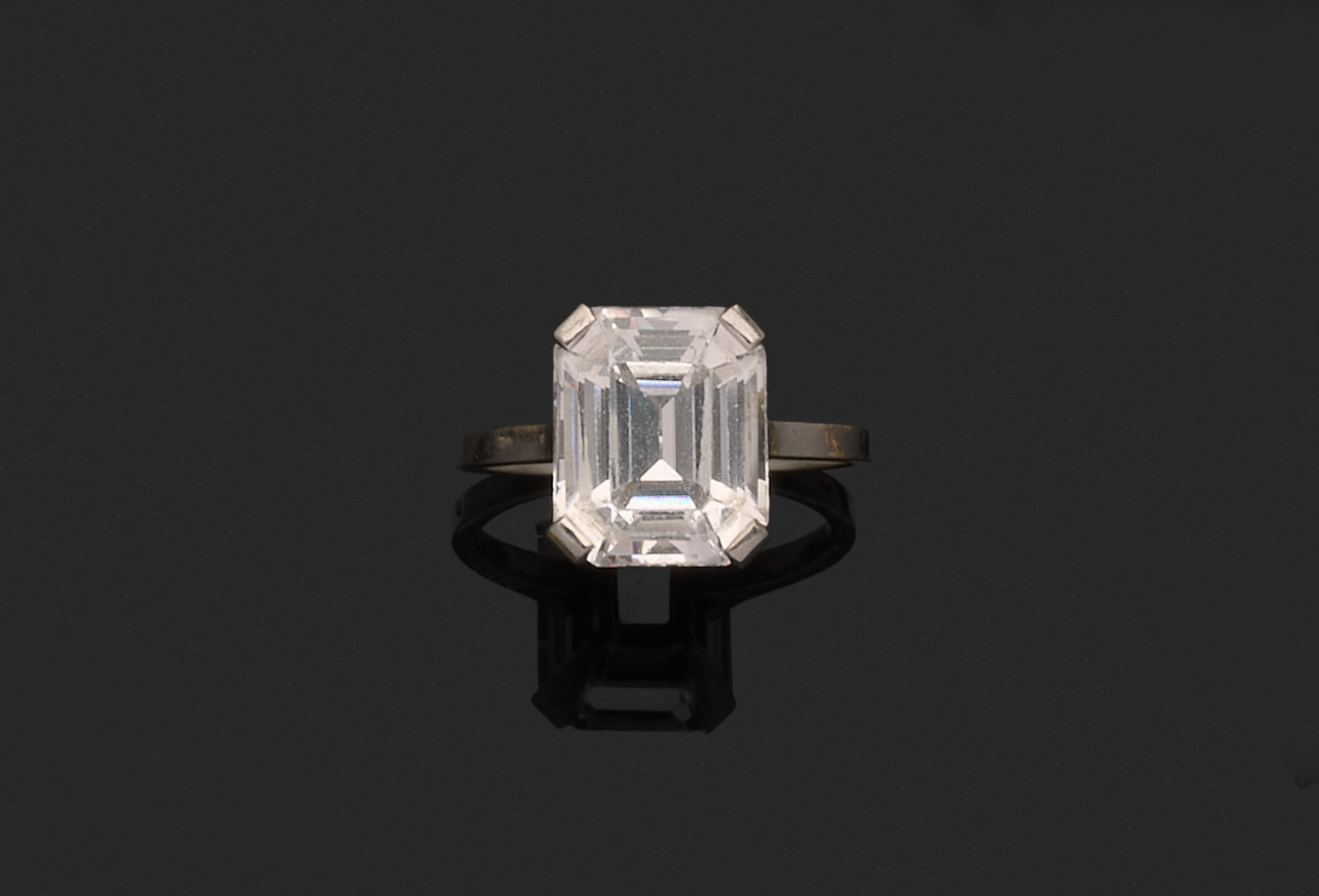 Or gris 750 millièmes, ornée au centre d'une pierre d'imitation blanche de forme rectangulaire à pans coupés.