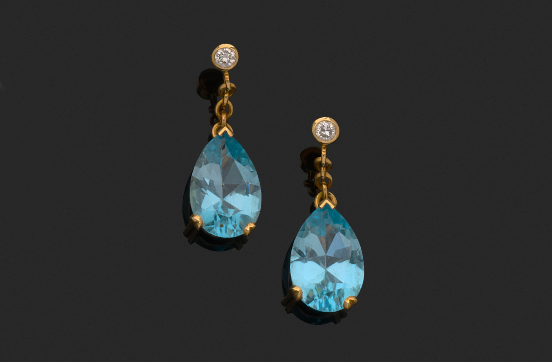 Or jaune 750 millièmes, chacun orné d'un diamant rond de taille brillant supportant en pampille une topaze bleue de forme poire.