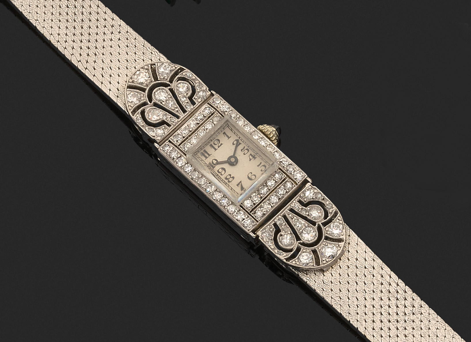 Or gris 750 millièmes, la montre de forme rectangulaire, cadran émaillé blanc, chiffres arabes pour les heures, chemin de fer pour les minutes. Le tour de lunette et les attaches à décor géométrique ornés de diamants ronds taillés en huit-huit ou de taille brillant, bracelet souple en or tressé.