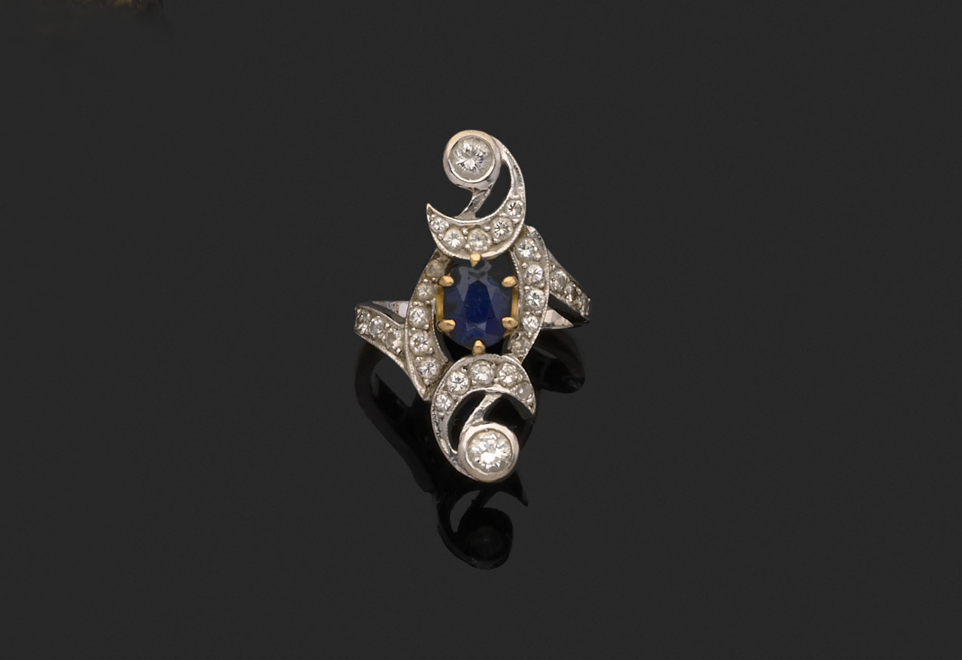 Or gris 750 millièmes, le centre orné d'un saphir...
