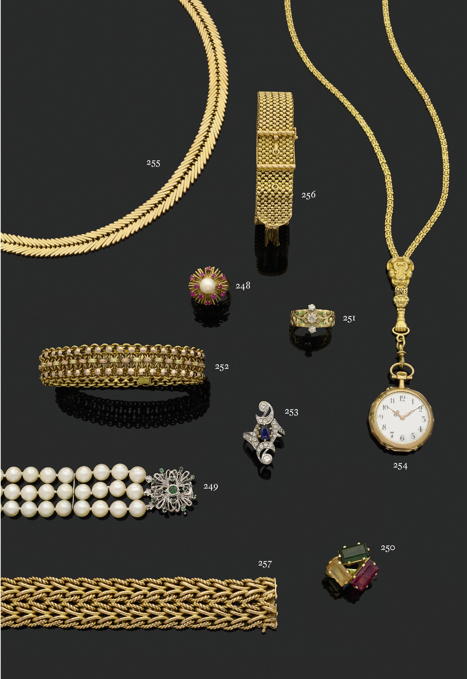 Or gris 750 millièmes, le centre orné d'un saphir dans un décor d'agrafes feuillagées serti de diamants ronds de taille brillant.
