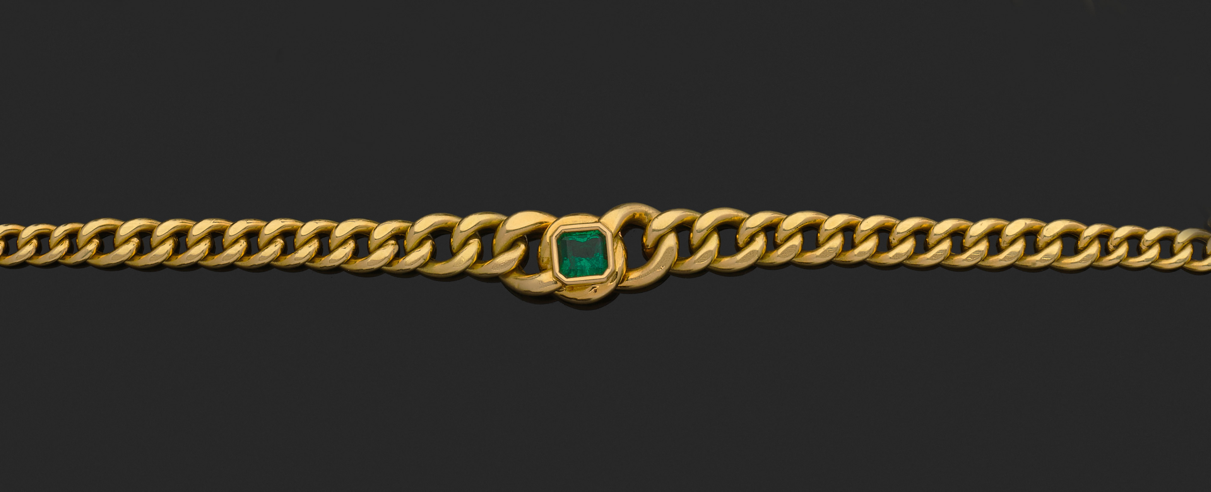 Or jaune 750 millièmes, les maillons en chute, décoré au centre d'une émeraude rectangulaire à pans coupés sertie clos.