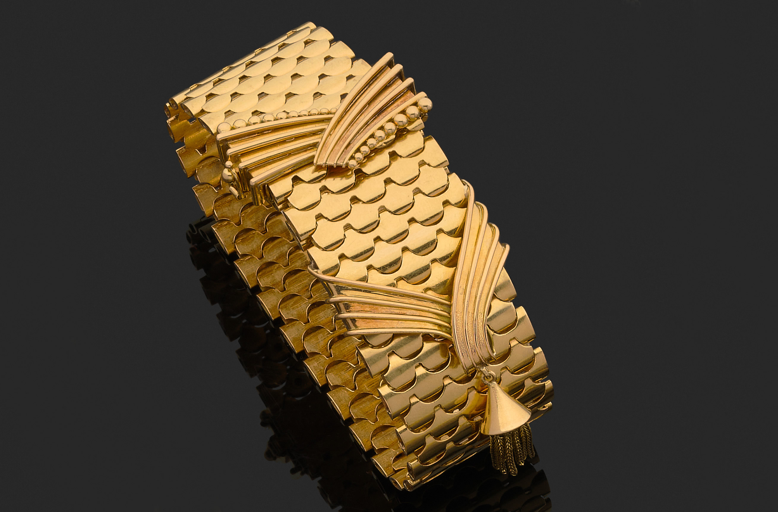 Or jaune 750 millièmes, les maillons à décor d'écaille, le fermoir figurant une boucle de ceinture retenant un pompon en pampille.