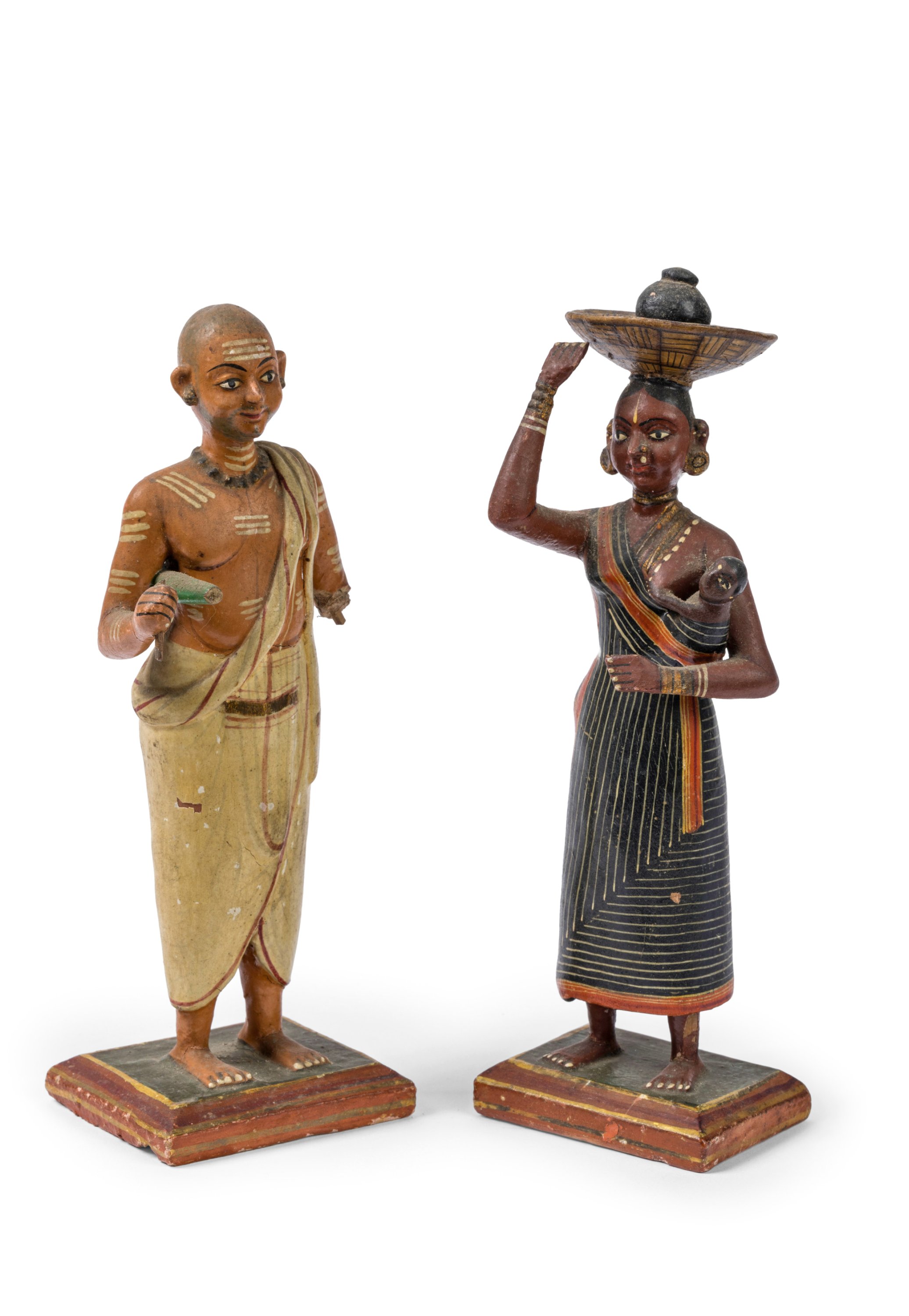 A pair of so-called "Javanese" carved polychrome wooden dolls. According to family lore, they were brought back to France by a lady-in-waiting to French Empress Eugenie upon her return from the opening ceremony of the Suez Canal.