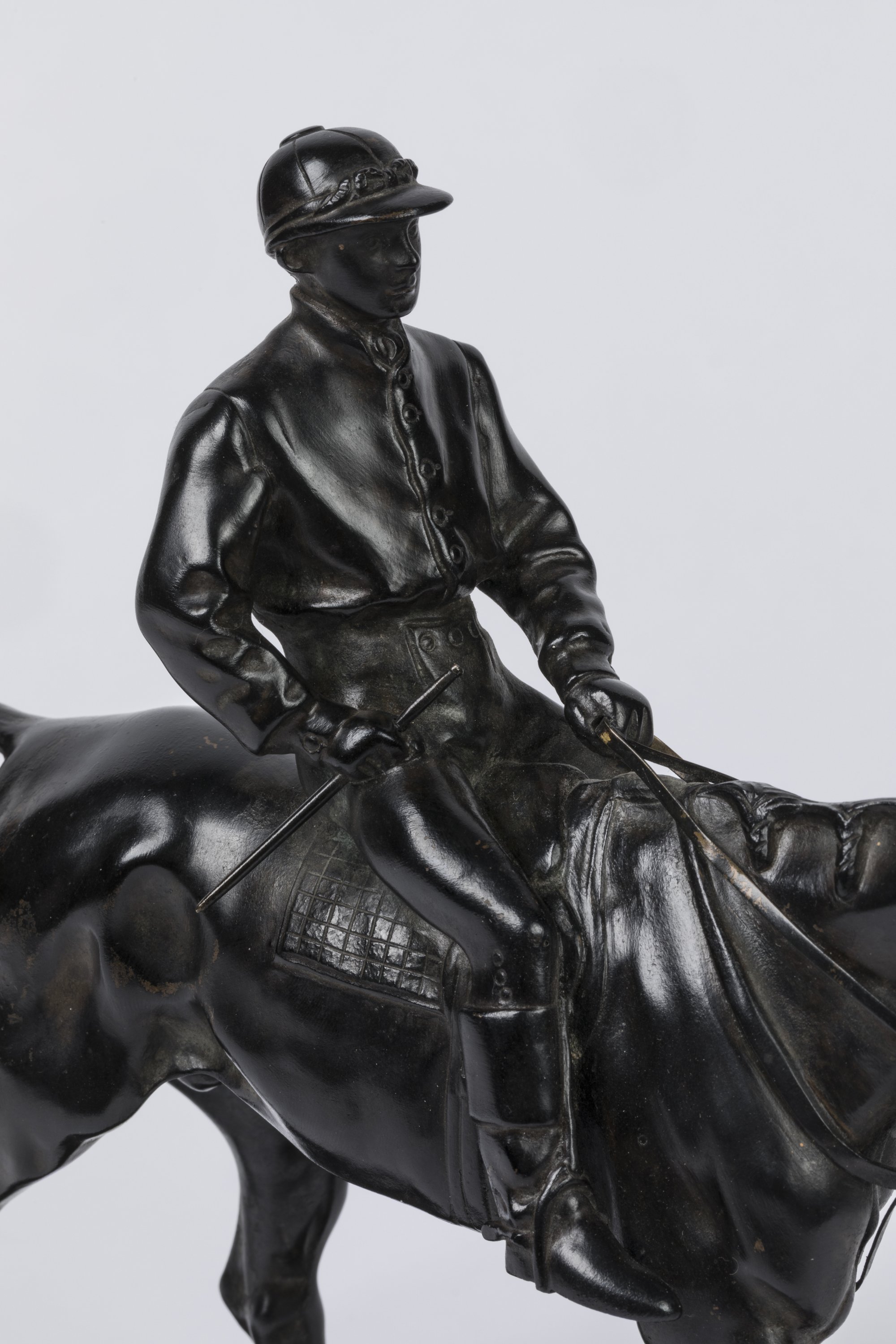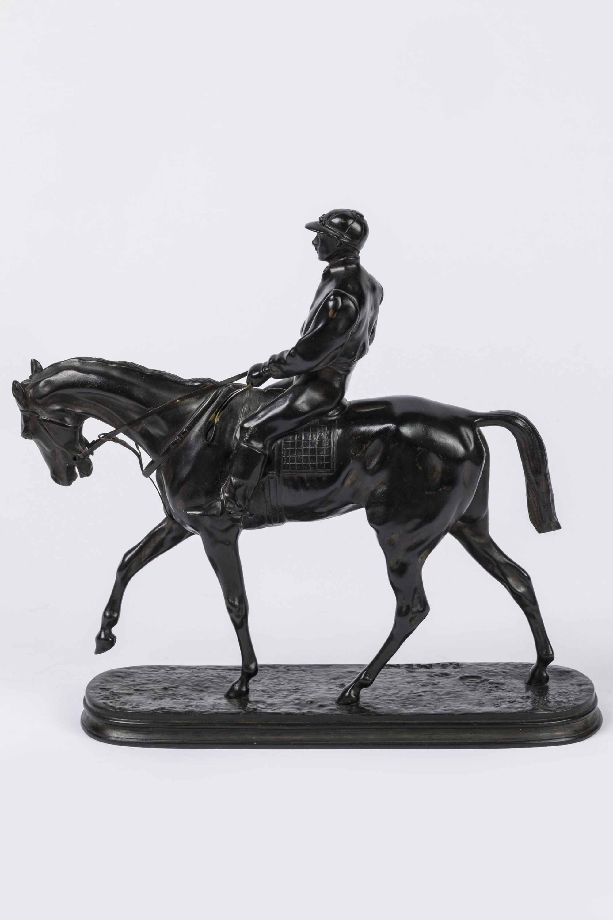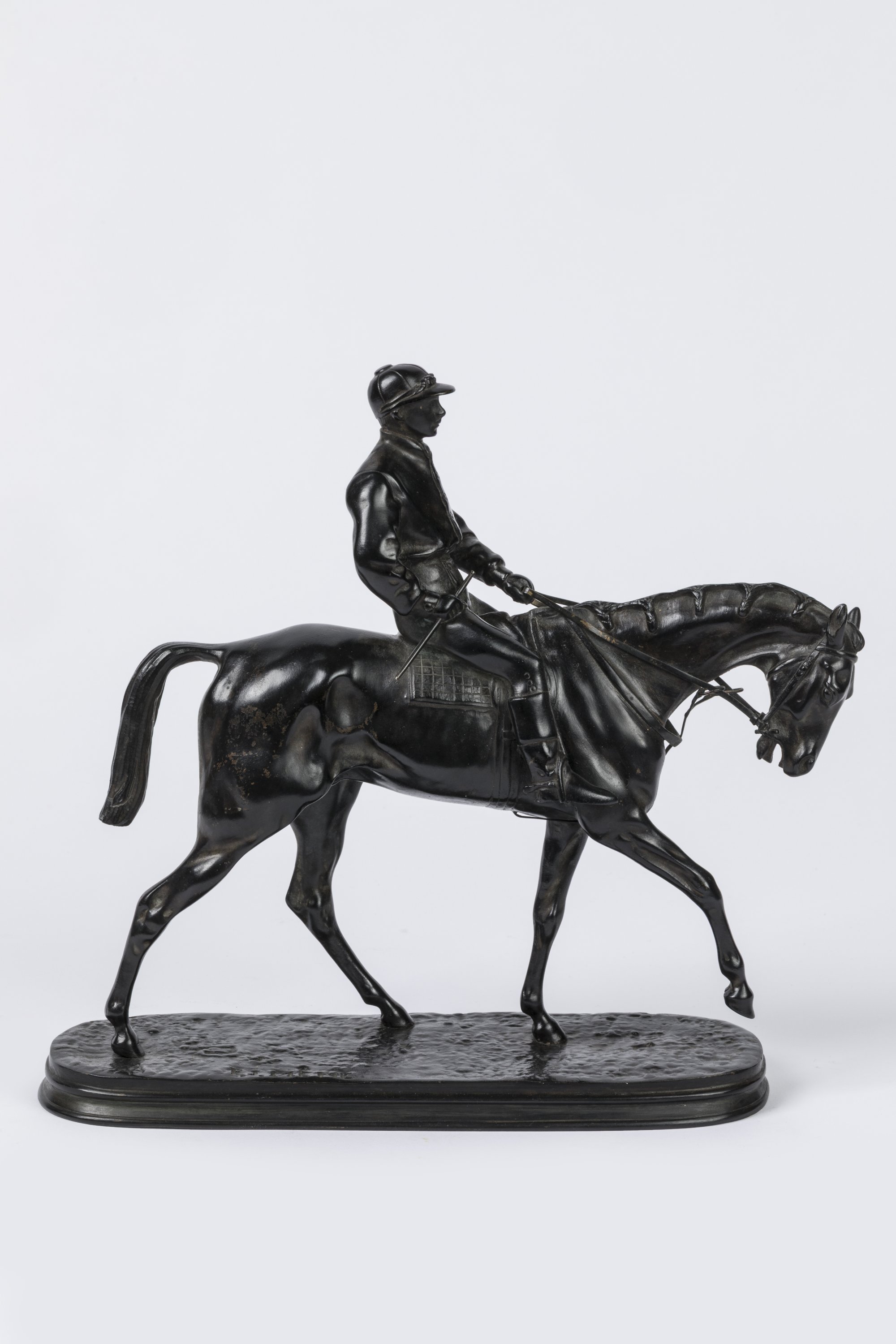 After Pierre-Jules Mène. A bronze sculpture of a jockey on horseback. Signed.